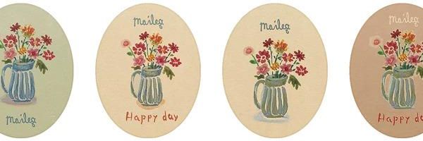 Owalna papierowa naklejka Maileg „Kwiaty w dzbanku” (5,5 cm) z logo marki to estetyczny detal do pakowania prezentów i zamówień. Sprawdzi się na kartkach, bilecikach i paczkach e-commerce, dodając całości dopracowanego wykończenia.