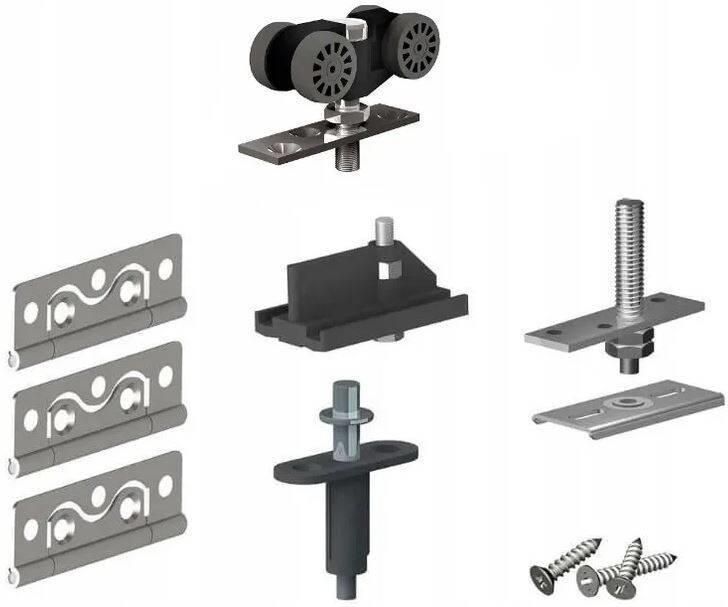Komplet wózków do 40 kg z akcesoriami, bez prowadnicy. Zawiera: 1x wózek HP40; 1x czop górny z osadą; 1x czop dolny z osadą; 3x zawias 134-102; komplet wkrętów; instrukcję montażu. Masa 0,59 kg/kpl