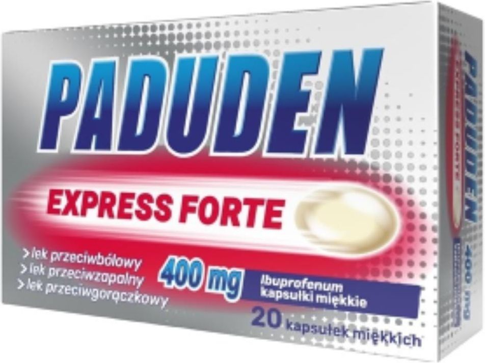 PADUDEN EXPRESS FORTE 400 mg, Ibuprofen, kapsułki miękkie Lek przeciwbólowy, przeciwzapalny i przeciwgorączkowy. W walce z bólem liczy się szybkość i precyzja. PADUDEN EXPRESS FORTE 400 mg to lek OTC zawierający 400 mg Ibuprofenu w 1 kapsułce miękkiej. Dzięki temu PADUDEN EXPRESS FORTE jest …