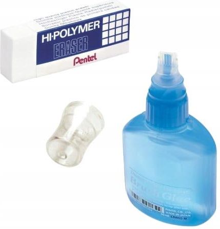 PENTEL Zestaw Klej w płynie + gumka ołówkowa Klej w płynie: Klej w płynie z dozownikiem w kształcie pędzelka. Bezzapachowy klej, do papieru, kartonu itp. Wygodny i bardzo czysty do użytkowania Nie zawiera substancji szkodliwych Specjalna konstrukcja pędzelka powoduje, że klej wypływa tylko przy zetknięciu z powierzchnią. Pojemność: 50 ml Gumka ołówkowa: Doskonale sprawdza się podczas ścierania śladów po ołówku, na każdym papierze. Wymazuje nie niszcząc kartki, dzięki polimerowej strukturze. Jest bardzo giętka i miękka dzięki czemu nie ma potrzeby mocnego dociskania. Jest niezwykle ekonomiczna, nie pęka, nie brudzi się, a nawet posiada zdolność samooczyszczenia. Dzięki unikalnym składnikom pozostawia mało ścinek. Bezpieczna dla dzieci - nie zawiera szkodliwych substancji, ze względów bezpieczeństwa stosujemy nieftalanowy plastyfikator Hexamoll DINCH by BASF.