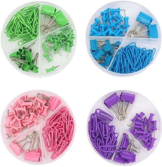 Zestaw akcesoriów biurowych MIX kolorów – pinezki, spinacze, klipsy w organizerze MIX kolorów wysyłany losowo Praktyczny i kolorowy zestaw niezbędnych akcesoriów biurowych, który sprawdzi się w biurze, szkole, domu czy pracowni. Wszystko zamknięte w poręcznym, przezroczystym organizerze z 4 przegródkami. Zawartość zestawu: Kolorowe spinacze biurowe (metalowe, powlekane) Klipsy (binder clips) do spięcia większej ilości dokumentów Pinezki do tablic korkowych Cechy produktu: 4 kolory zestawu: zielony, niebieski, różowy, fioletowy (wysyłane losowo) Praktyczne, zamykane pudełko z podziałem na przegródki Wygodne przechowywanie i łatwy dostęp do elementów Idealny do organizacji dokumentów, notatek, przypinania ogłoszeń Zastosowanie: Biuro i praca z dokumentami Zajęcia szkolne i uczelniane Prace kreatywne, organizacja tablic inspiracji i planów Dlaczego warto? Zestaw łączy funkcjonalność z estetyką – kolorowe dodatki ożywią każde miejsce pracy, a porządek w dokumentach stanie się prostszy niż kiedykolwiek.
