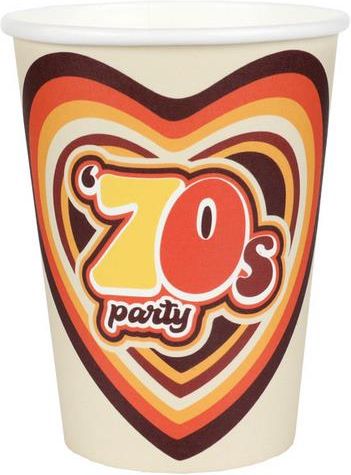 Kubeczki papierowe z zestawu lata 70-te. Idealne na imprezę w stylu disco. Pojemność: 270 ml. Wymiary: 7.8 x 9.7 cm. Opakowanie: 10 szt.