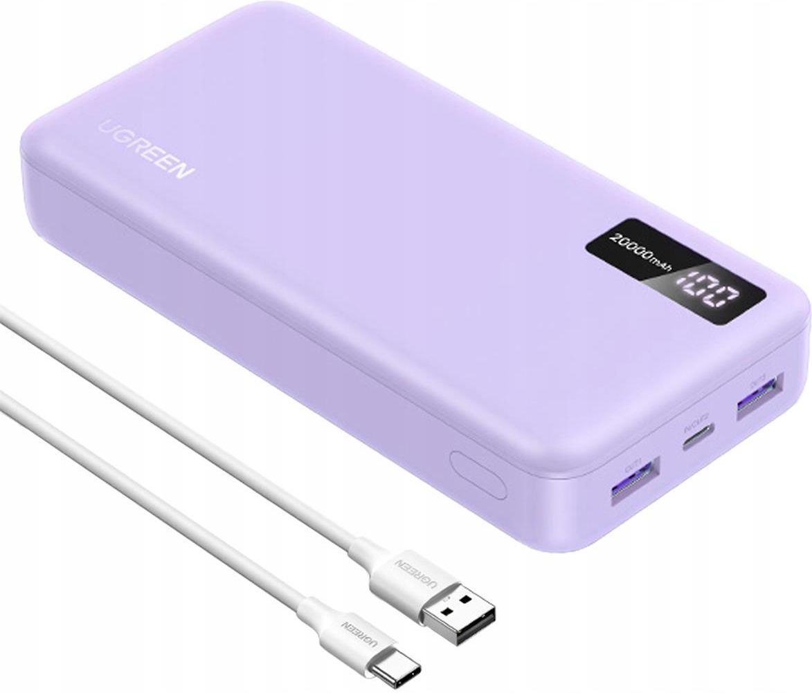 Ugreen Powerbank Do Telefonu Pojemny 20000mAh 2xUSB + USB-C 20W Wyświetlacz Powerbank Ugreen PB312 ładuje urządzenia z mocą 22.5 W, co pozwala na szybkie ładowanie nawet najbardziej wymagających sprzętów. Przykładowo, naładuje iPhone’a 15 Pro do 60% w zaledwie 30 minut. Jego pojemność 20000 mAh dostarcza energii przez wiele dni, a pełne naładowanie samego powerbanku zajmuje tylko 6 godzin. Te atuty sprawiają, że model Ugreen PB312 jest niezawodny w każdej sytuacji. Specyfikacja Producent: Ugreen Model: PB312 Kod produktu: 65590B Kolor: fioletowy Moc wyjściowa: 22.5 W Porty ładowania: 2 USB-A i 1 USB -C Waga: 435g Napięcie: 5V Pojemność akumulatora: 20000MAh Wymiary: 14.7 cm x 7.16 cm x 2.77 cm Waga: 435g Zalety Duża pojemność 20000 mAh: zapewnia wielodniowe źródło energii, idealne na długie podróże i intensywne użytkowanie. Szybkie ładowanie 22,5 W: pozwala na szybkie uzupełnienie energii, np. iPhone 15 Pro naładuje do 60% w 30 minut. Trzy porty USB (2x USB-A + USB-C): umożliwiają jednoczesne ładowanie aż trzech urządzeń, co jest bardzo wygodne. Inteligentny cyfrowy ekran: informuje o statusie powerbanku i poziomie naładowania. Zaawansowane zabezpieczenia: ochrona przed przepięciami, przeciążeniem, przeładowaniem, rozładowaniem, wysoką temperaturą oraz zwarciem, wykonany z ogniotrwałych materiałów. Inteligentny monitoring i bezpieczeństwo Wyposażony w inteligentny cyfrowy ekran, Ugreen PB312 monitoruje pracę powerbanku, informując Cię na bieżąco o jego statusie. Zbudowany z ognioodpornych materiałów na poziomie V0 i zatwierdzony przez linie lotnicze, gwarantuje najwyższy poziom bezpieczeństwa. Oprócz tego jest odporny na przepięcia, przetężenia, przeładowania, nadmierne rozładowania, wysokie temperatury, oraz krótkie spięcia. Wszechstronna kompatybilność Powerbank PB312 jest kompatybilny z wieloma urządzeniami, takimi jak słuchawki bezprzewodowe, smartwatche, telefony i wiele innych. Dzięki trzem portom USB, możesz ładować trzy urządzenia jednocześnie, co jest niezwykle wygodne w podróży lub w sytuacjach, gdy masz ograniczony dostęp do zasilania. Funkcja Pass-through Dzięki funkcji Pass-through, powerbank umożliwia jednoczesne ładowanie jego akumulatora oraz podłączonych do niego urządzeń. Maksymalna moc ładowania przy korzystaniu z tej funkcji wynosi 15W, co pozwala zaoszczędzić wiele czasu i zapewnia ciągłe zasilanie bez przerw. Kompaktowe wymiary Pomimo swojej dużej pojemności, Ugreen PB312 zachowuje kompaktowe wymiary, dzięki czemu jest łatwy do przenoszenia i idealny do codziennego użytku. Niezależnie od tego, czy jesteś w podróży, w pracy, czy w domu, ten powerbank zapewni Ci niezawodne wsparcie energetyczne. Ciesz się nieograniczoną mobilnością oraz bezpieczeństwem swoich urządzeń.