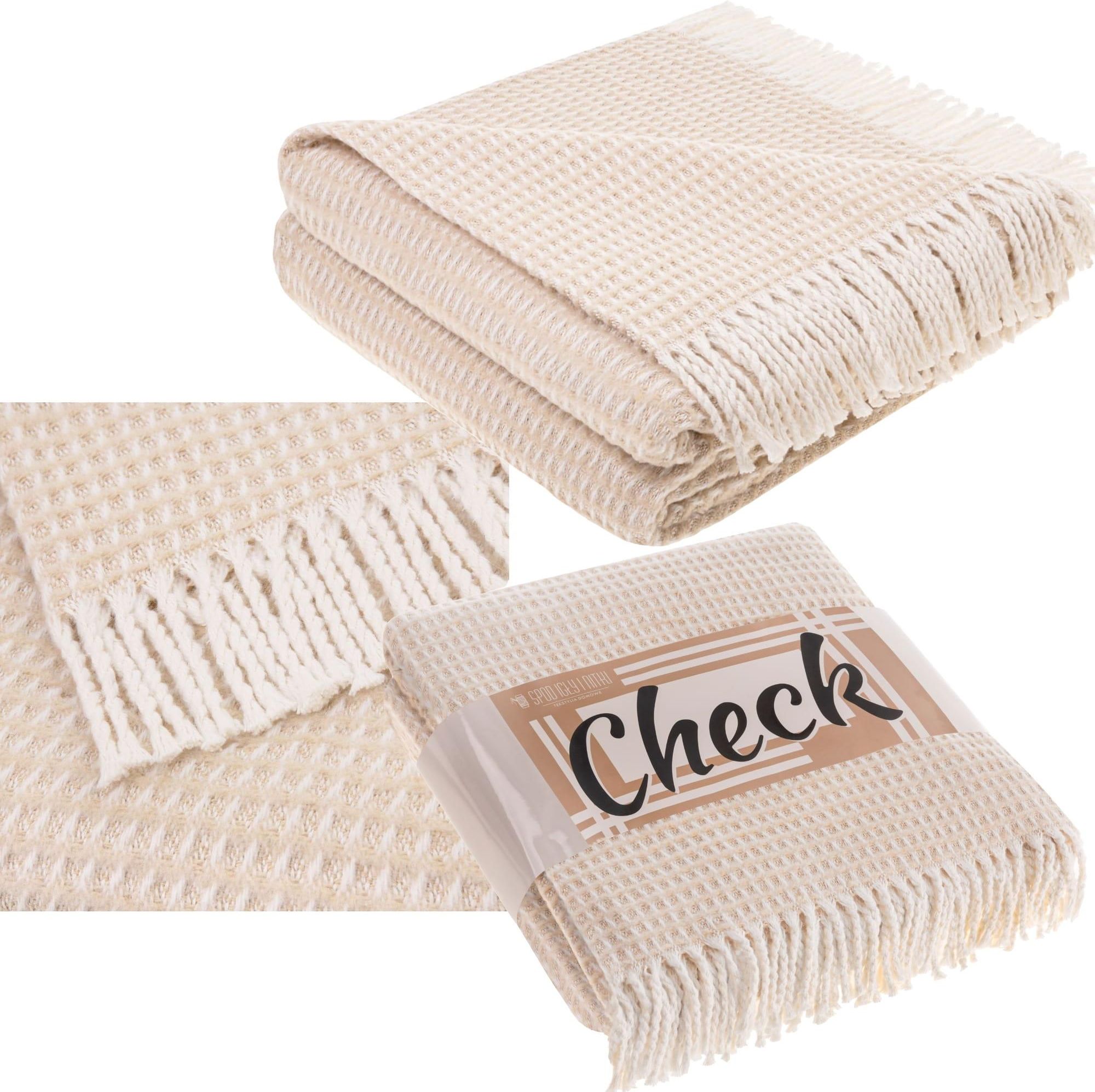 Koc Bawełniany Akrylowy 150X200 Check Pled Beżowy Z Frędzlami I23 Mrozy