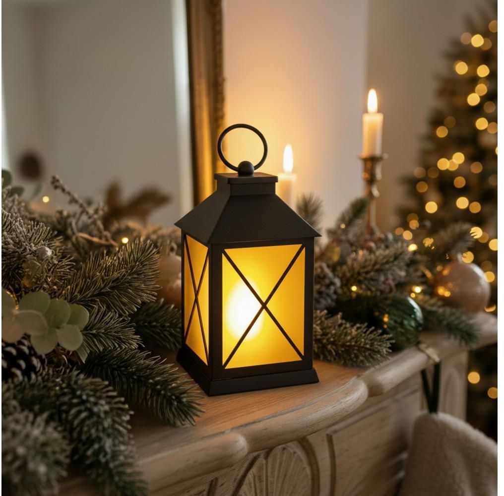 Świąteczna latarnia z migoczącym płomieniem. Kolor światła: ciepła biel. Czasomierz 6h/18h, który zapewnia automatyczne wyłączenie i ponowne włączenie. Można również sterować ręcznie. Stopień ochrony: IP20 (do użytku wewnątrz). Zasilanie: 2x baterie A