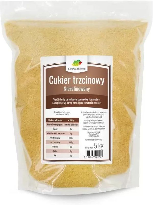 CUKIER TRZCINOWY naturalny BRĄZOWY 5kg CO WYRÓŻNIA NASZ PRODUKT 1✔️Niepowtarzalny, karmelowy aromat i jasnobrązowa barwa pochodzące bezpośrednio z trzciny cukrowej. Bogate źródło cennych minerałów, takich jak magnez, żelazo, potas i wapń. Wszechstronność zastosowania – jako zamiennik białego cukru do słodzenia napojów, deserów, ciast i drinków. Zachowane naturalne właściwości i wartości odżywcze, dzięki czemu stanowi zdrowszą alternatywę dla rafinowanego cukru białego. CZYSTY, NATURALNY SMAK NATURY Nasz wysokiej jakości cukier trzcinowy zachwyca niepowtarzalnym, karmelowym aromatem i jasnobrązową barwą, które pochodzą prosto z trzciny cukrowej. To naturalna słodycz w najczystszej postaci, bez sztucznych dodatków. ŹRÓDŁO WARTOŚCIOWYCH MINERAŁÓW Oprócz delikatnego, wyjątkowego smaku, cukier trzcinowy jest bogatym źródłem cennych składników mineralnych, takich jak magnez, żelazo, potas i wapń, które wspierają prawidłowe funkcjonowanie organizmu. WIELOFUNKCYJNY SŁODZIK Cukier trzcinowy to doskonały zamiennik białego cukru, który można stosować do słodzenia napojów, deserów, ciast, a nawet drinków. Jego karmelowy posmak nadaje wyjątkowego charakteru każdej potrawie. ZDROWA PRZYJEMNOŚĆ W przeciwieństwie do rafinowanego cukru białego, cukier trzcinowy zachowuje swoje naturalne właściwości i wartości odżywcze, dzięki czemu stanowi zdrowszą i bardziej świadomą alternatywę dla tych, którzy cenią wysoką jakość i dbają o swoje samopoczucie. SPECYFIKACJA Marka: Słodkie Zdrowie Rodzaj: cukier trzcinowy Waga: 5 kg Produkt nie zawiera: antyzbrylaczy