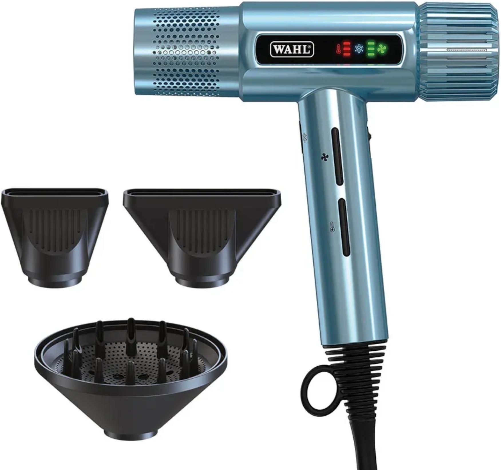 PROFESJONALNA Suszarka do włosów WAHL 4321-0472 Vanquish COOL BLUE z Jonizacją WAHL Vanquish to najnowsza suszarka w ofercie firmy, którą koniecznie musisz posiadać. Dzięki technologii FlowControl suszenie włosów jest szybkie, ciche i równomierne. Polecana do stylizacji krótkich oraz długich włosów. PRĘDKOŚĆ SILNIKA I PRZEPŁYWU POWIETRZA Moc pobierana przez WAHL Vanquish wynosi 1600 W. Ta moc jest wystarczająca do delikatnego, a zarazem bardzo efektywnego suszenia włosów. Suszarka do włosów jest wyposażona w wysokiej jakości silnik DC z technologią SmoothTone, która redukuje poziom hałasu i drgań urządzenia. 3 TRYBY TEMPERATURY, 3 PRĘDKOŚCI ORAZ FUNKCJA ZIMNEGO POWIETRZA Wahl Vanquish ma 3 tryby prędkości i 3 tryby temperatury, które razem dają 7 trybów pracy, w tym zimne powietrze z oddzielnym przyciskiem. Przycisk zimnego powietrza chłodzi przegrzane włosy i pozwala utrwalić stworzoną stylizację. Wybierając żądaną temperaturę lub prędkość powietrza, możesz ustawić żądany tryb. Suszarka posiada funkcję pamięci ustawień dzięki której raz zastosowany profil pozostanie z nią do kolejnego suszenia. ERGONOMIA I KONTROLA Wahl Vanquish jest wykonany w kompaktowej i wygodnej obudowie. Dobra równowaga wagowa - 340 gramów, nie obciąża dłoni, co jest bardzo ważne podczas korzystania z suszarki. Przewód zasilający ma długość 3 metrów, co zapewnia duży stopień swobody. Model jest również wyposażony w oczko do zawieszania, która umożliwia zawieszenie suszarki na haczyku w dowolnym momencie. Ekran LED sprawia, że ​​sterowanie suszarką jest przejrzyste, wygodne i komfortowe. Specyfikacja Moc suszarki: 1600 W Tryby pracy suszarki: 7 3 prędkości nawiewu 3 tryby temperatury Chłodne powietrze Funkcja pamięci ustawień Typ silnika: obrotowy (prąd stały) Typ zasilania: sieciowa Długość przewodu: 3 m Dwukolorowy wyświetlacz LED Waga: 340 g Bez szczotkowy silnik cyfrowy 100-240 V, 50/60 Hz W zestawie Profesjonalna suszarka do włosów WAHL Vanquish 2 magnetyczne koncentratory powietrza Dyfuzor magnetyczny Instrukcja