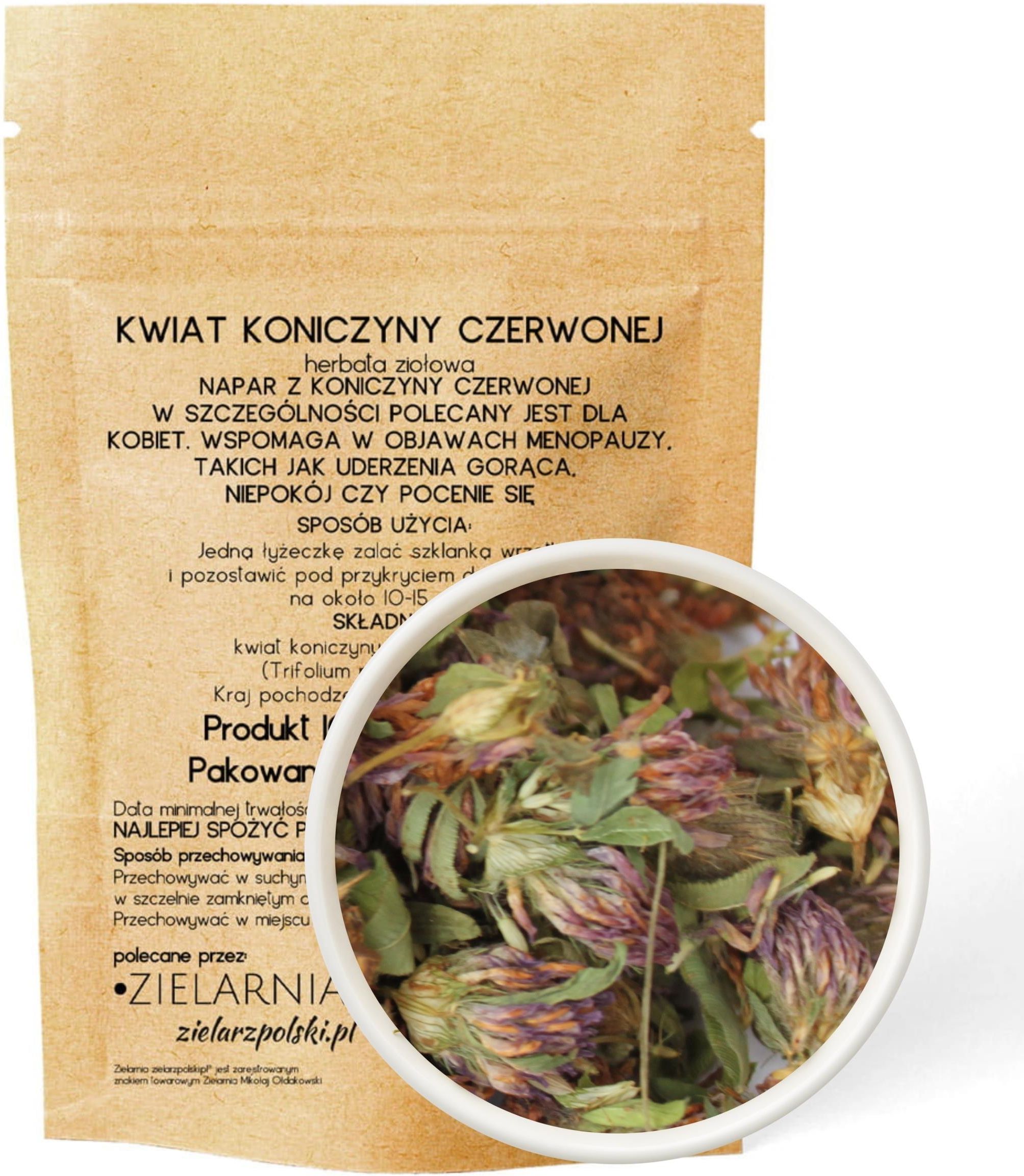 Kwiat koniczyny czerwonej rozdrobniony 50G ZIELARZPOLSKI Dlaczego warto wybrać suszone kwiat koniczyny czerwonej od Zielarz Polski? Polski surowiec- POLSKA KONICZYNA! Surowiec wysokiej jakości. PRODUKT 100 % NATURALNY. PAKOWANY RĘCZNIE W POLSCE. Rozdrobniony pięknie wysuszony kwiat. Wygodne do mieszania z innymi ziołami lub picia samodzielnie. PRAKTYCZNE I BEZPIECZNE papierowe opakowanie z wielokrotnym zamknięciem strunowym. Herbata z kwiatu koniczyny czerwonej to wyjątkowy, aromatyczny napój o łagodnym, słodkawym smaku. Posiada delikatne nuty kwiatowe z lekką domieszką miodowej słodyczy, co sprawia, że herbata staje się przyjemna dla podniebienia. Kwiat koniczyny czerwonej Wspomaga w objawach menopauzy. Takich jak uderzenia gorąca niepokój pocenie się Sposób użycia Jedną łyżeczkę zalać szklanką wrzątku i pozostawić pod przykryciem do zaparzenia na około 10-15 minut. Pić 1-2 razy dziennie WYGODNE PAPIEROWE OPAKOWANIE Dzięki zastosowaniu opakowania typu DOYPACK z membraną z wygodnym zamknięciem strunowym mamy pewność że zioła będą odpowiednio przechowywane i dłużej zachowają świeżość. Składniki Kwiat koniczyny czerwonej 100% Kraj pochodzenia surowca: POLSKA Sposób przechowywania Przechowywać w suchym miejscu, w temperaturze pokojowej w szczelnie zamkniętym opakowaniu. Przechowywać w miejscu niedostępnym dla małych dzieci. Zawartość netto: 50g Zdjęcia ziół mogą być zdjęciami symbolicznymi lub propozycją podania. Informację o ziołach nie stanowią porady medycznej. Kobiety w ciąży, matki karmiące, osoby zażywające leki lub osoby chore powinny przed użyciem skontaktować się z lekarzem Wyprodukowano w Polsce dla PERSEA SP. Z O.O. ul. Rakowiecka 5/37 02-517 Warszawa