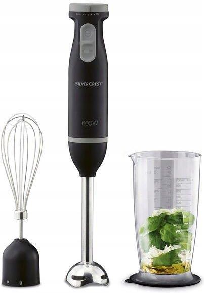 Blender ręczny SilverCrest SSMS 600 E6 600W czarny Opis produktu 3 w 1: do miksowania, robienia purée i rozdrabiania bezstopniowo regulowana prędkość przycisk turbo umożliwiający silne miksowanie impulsowe szybko zdejmowana stopa blendera* ze stali szlachetnej ze specjalną konstrukcją do …