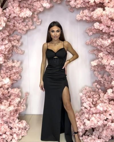 Zjawiskowa długa sukienka z rozporkiem eksponującym lewą nogę. Sukienka wykonana z miękkiego elastycznego materiału, góra gorsetowa usztywniana z wszytymi miseczkami oraz możliwością doczepienia ramiączek. Na biuście marszczenia, ozdobione koralikami. Fikuśny prześwit pod biustem ozdobiony …