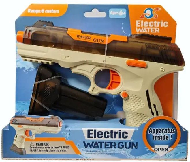 Elektryczny pistolet z pojemnikiem na wodę. Mechanizm elektryczny umożliwia szybkie strzelanie. Podczas strzelania pistolet wydaje dźwięki. Posiada 2 pojemniki na wodę o pojemności 75 ml każdy. Zabawka przeznaczona dla dzieci od lat 6. Produkt działa na baterię litową akumulator, załączony do zabawki. Zabawka zapakowana w kartonowe pudełko. Podane wymiary są wymiarami opakowania.