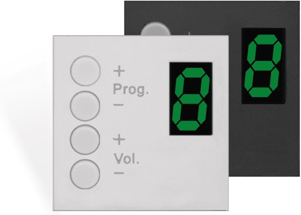 Kontroler ścienny do zabudowy podtynkowej, który po zainstalowaniu w strefie daje możliwość wyboru źródła audio oraz regulację głośności.