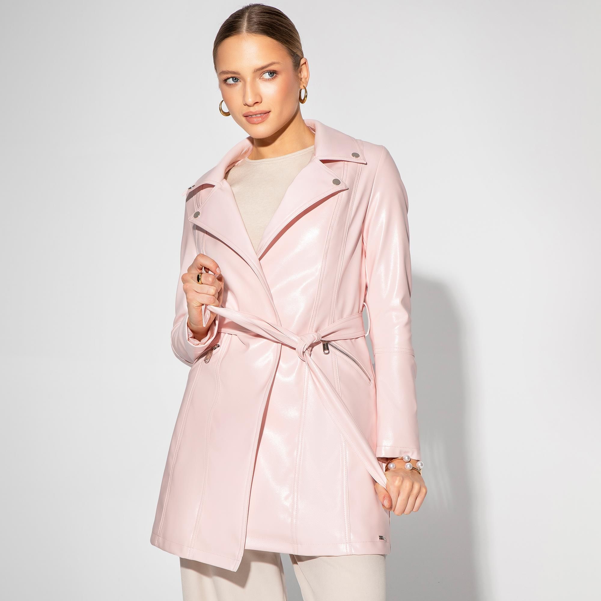 Damski płaszcz z imitacji skóry różowy Mszczonów
