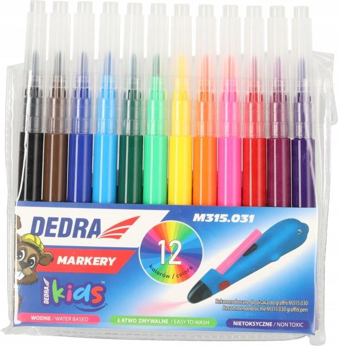 WYMIENNE MARKERY ZESTAW 12SZT DO M315.030 DEDRA Wymienne markery DEDRA M315.031. Markery zostały wyprodukowane na bazie wody, co zapewnia bezpieczeństwo użytkowania nawet przez najmłodszych użytkowników. Atrament na bazie wody ułatwia zmywanie pozostałości śladów po zabawie pisakiem, co z pewnością …