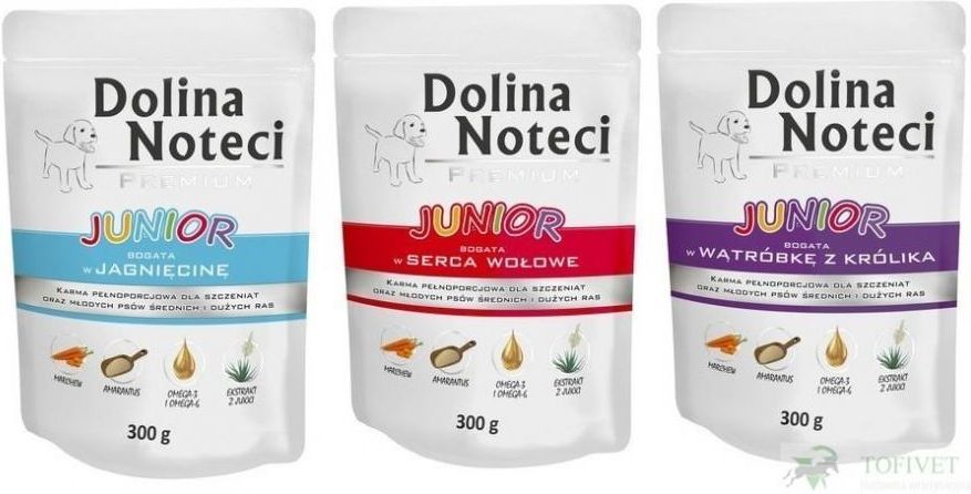 DOLINA NOTECI JUNIOR MIX SMAKÓW 7x300gKarma pełnoporcjowa PREMIUM bogata w mięso Karma dla szczeniąt wszystkich rasKarma charakteryzuje się wysoką strawnością pełnowartościowego białka oraz kwasów tłuszczowych z rodziny n-3 i n-6.Wysoka zawartoœć metioniny i cystyny w mięsie, –aminokwasów …