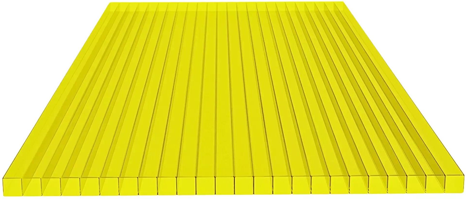 Poliwęglan komorowy 6000x1050 żółty 10 mm UV ochrona długość wzdłuż komory - 1050mm, szerokość poprzek komór - 2100mm; UWAGA! Odchylenie przy cięciu +-3-5mm. Po wykonaniu cięcia na poliwęglanie, w komorach płyty mogą znajdować się opiłki. Płyty z poliwęglanu cieszą się w dzisiejszej branży budowlanej ogromną popularnością. Nie ma się co dziwić, zwłaszcza jeżeli wziąć pod uwagę ich właściwości. Tego typu produkty są niemal całkowicie obojętne na działanie szkodliwych warunków atmosferycznych, takich jak np. skrajnych temperatur, odporne na promieniowanie UV i gradobicie. Ponadto wykazują się one dużą odpornością na uszkodzenia mechaniczne, są ognioodporne. Warto również zaznaczyć, że płyty poliwęglanowe są materiałem łatwym w codziennej pielęgnacji. W przeciwieństwie do innych produktów, jak np. szkła, nie tworzą się na nich zacieki, a ewentualne zabrudzenia są stosunkowo mało widoczne. Zastosowanie płyt poliwęglanowych: zadaszenia, wiaty, przystanki werandy, ogrody zimowe, pergole szklarnie daszki nad wejściem, wiatrołapy sufity podwieszane, ścianki działowe wypełnienie bram, drzwi i balustrad Właściwości płyt poliwęglanowych: dobra przepuszczalność światła odporność na warunki atmosferyczne doskonałe parametry termoizolacyjne duża odporność na uderzenia lekkość połączona z dużą sztywnością materiału możliwość gięcia płyt na zimno łatwość obróbki i montażu płyt