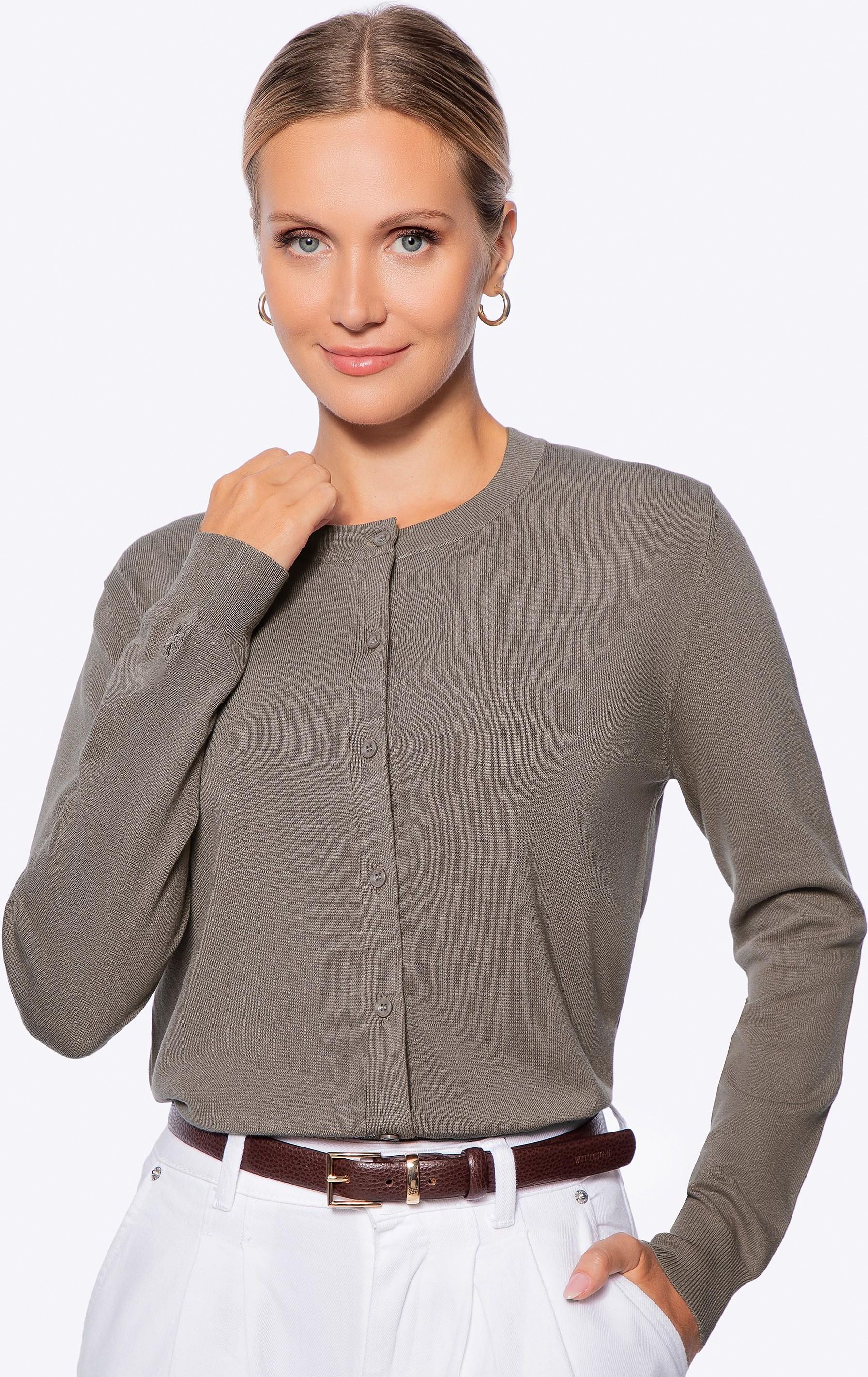 Damski kardigan – lekkość i styl na każdą okazję Ten kardigan to połączenie miękkości i wygody, które docenisz każdego dnia. Wykonany z delikatnej mieszanki wiskozy i nylonu, zapewnia przyjemne uczucie lekkości i komfortu. Zapięcie na guziki na całej długości daje możliwość dowolnej stylizacji – możesz nosić kardigan rozpięty dla swobodnego look’u lub zapięty, by dodać elegancji. Okrągły dekolt oraz długie rękawy zakończone ściągaczem podkreślają klasyczny, ponadczasowy charakter modelu, który sprawdzi się jako niezastąpiony basic w Twojej garderobie. Dla kogo? Jeśli szukasz swetra, który łączy w sobie lekkość, wygodę i uniwersalny design, ten model spełni Twoje oczekiwania. Idealny zarówno do pracy, jak i na spotkania towarzyskie. Nasza rada: Noś kardigan z ulubionymi jeansami lub eleganckimi spodniami. Sprawdzi się również w zestawieniu z sukienką czy spódnicą, dodając stylizacji lekkości i kobiecego wdzięku. Do tego wybierz klasyczne baleriny lub eleganckie mokasyny, które podkreślą kobiecy charakter każdej stylizacji. Kluczowe cechy: Materiał: Miękka, lekka dzianina z wiskozy i nylonu zapewnia komfort i delikatność podczas noszenia. Zapięcie: Guziki na całej długości pozwalają na łatwe dopasowanie stylu — możesz nosić kardigan rozpięty dla swobodnego look’u lub zapięty, by dodać elegancji. Ponadczasowy dekolt: Klasyczny, okrągły dekolt zapewnia uniwersalny design, który łatwo łączy się z różnymi stylizacjami, podkreślając Twój wyrafinowany wygląd. Wykończenie rękawów: Długie rękawy zakończone subtelnym ściągaczem gwarantują komfort i estetyczne dopasowanie, chroniąc przed chłodem i nadając całości delikatną finezję. Idealne dopasowanie u dołu: Wykończenie ze ściągaczami zapewnia stabilne przyleganie, dzięki czemu kardigan pozostaje na miejscu. Detale: Haftowane logo producenta na prawym rękawie to delikatny, ale wyrazisty akcent. Skład: Wiskoza 89%, nylon 11%. Postaw na kardigan, który doda Twoim stylizacjom lekkości i klasycznej elegancji.