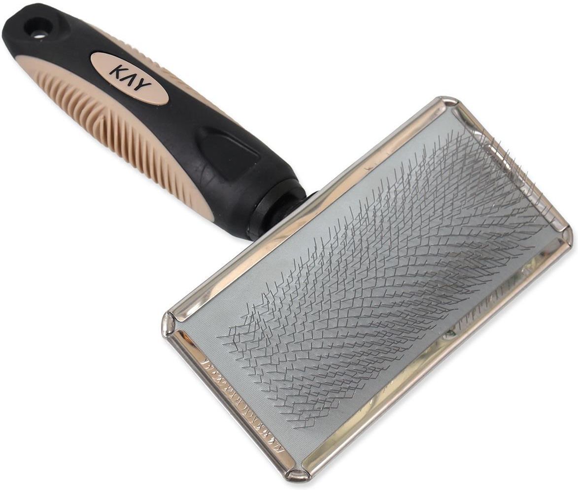 Charakterystyka szczotki dla psa marki KayJednostronna szczotka marki Kay przeznaczona jest do wyczesywania każdego rodzaju sierści. Druciane, cienkie włosie skutecznie usuwa kurz, martwe włosie i podszerstek. Duża powierzchnia czesząca doskonale sprawdzi się w pielęgnacji większych psów. Ergonomiczny kształt rączki oraz antypoślizgowe elementy zapewniają pewny chwyt i wygodne użytkowanie szczotki.