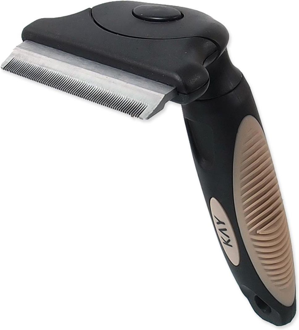 Grzebień dla psów KAY comb L Grzebień z grubymi metalowymi zębami przeznaczony do czesania sierści psów, kotów, koni i innych zwierząt domowych. Redukuje linienie o ponad 90%. Przeznaczony dla ras długowłosych i krótkowłosych. Z łatwością usuwa martwe włosy z podszerstka, zapewniając większą skuteczność niż zwykłe grzebienie. Należy zachować szczególną ostrożność podczas czesania okolic twarzy i odbytu zwierzęcia. Może to spowodować zranienie zwierzęcia. Podczas czesania należy wywierać proporcjonalny nacisk na końcówki grzebienia, aby uniknąć obrażeń skóry. Tylko dla zwierząt.