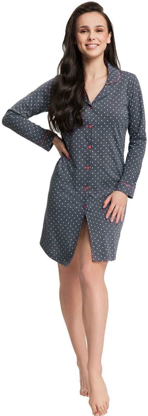 Koszula damska 42 grafitowa w gwiazdki wykonana z bawełnianej dzianiny. Dekolt w serek, z kołnierzem i zapięciem na guziki na całej długości. Ten typ zapięcia jest bardzo praktyczny, docenią go również panie karmiące piersią. Rękawy długie, wykończone mankietem. Dół koszuli lekko zaokrąglony. Długość koszuli przed kolana. Koszula nocna w kratę o luźnym kroju układa się na każdej sylwetce. Koszula przyda się nie tylko podczas nocnego wypoczynku, ale również jako wygodny strój domowy, w którym można wypić poranną kawę, czy pogawędzić przez telefon. Rozmiar: XL Materiał: 100% bawełna Przepis konserwacji: prać w temperaturze do 40°C, prasować w temperaturze 110°C, nie chlorować, nie czyścić chemicznie, nie wybielać.
