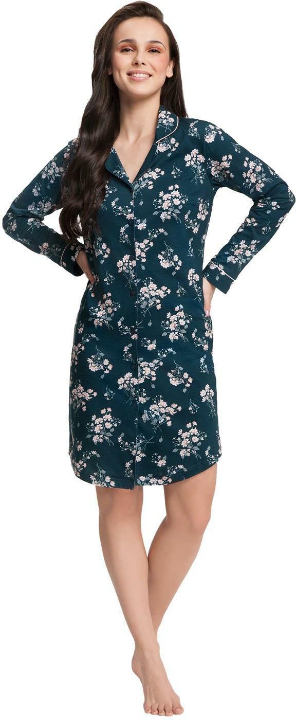 Koszula damska 42 granatowa w kwiaty wykonana z bawełnianej dzianiny. Dekolt w serek, z kołnierzem i zapięciem na guziki na całej długości. Ten typ zapięcia jest bardzo praktyczny, docenią go również panie karmiące piersią. Rękawy długie, wykończone mankietem. Dół koszuli lekko zaokrąglony. Długość koszuli przed kolana. Koszula nocna w kratę o luźnym kroju układa się na każdej sylwetce. Koszula przyda się nie tylko podczas nocnego wypoczynku, ale również jako wygodny strój domowy, w którym można wypić poranną kawę, czy pogawędzić przez telefon. Rozmiar: XXL Materiał: 100% bawełna Przepis konserwacji: prać w temperaturze do 40°C, prasować w temperaturze 110°C, nie chlorować, nie czyścić chemicznie, nie wybielać.