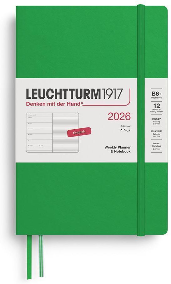 Planer tygodniowy z notatnikiem Leuchtturm1917 B6+ 2026 | Spring Leaf Planer tygodniowy Leuchtturm1917 w formacie Paperback (B6+) w kolorze Spring Leaf. Obejmuje okres od stycznia 2026 do grudnia 2026 roku. Układ tygodnia zawiera siedem dni na jednej stronie, a po przeciwnej stronie znajduje się miejsce na notatki – idealne do zapisywania zadań, pomysłów czy list rzeczy do zrobienia. Planer zawiera przegląd trzech lat (2026, 2027 i 2028), planer projektów, informacje o fazach księżyca oraz oficjalne święta obowiązujące w 58 krajach. W środku znajdują się perforowane kartki na notatki do łatwego wyrwania, rozkładana kieszeń na drobiazgi, dwie tasiemki-zakładki oraz elastyczna gumka zamykająca. Dzięki szytemu grzbietowi planer otwiera się na płasko, co zapewnia komfort pisania. Wykonany z bezkwasowego papieru o gramaturze 80 g/m2, świetnie sprawdzi się także przy użyciu pióra wiecznego. Do planera dołączony jest zestaw naklejek do opisywania i archiwizacji. Format: Paperback (B6+) – 125 x 190 mm.