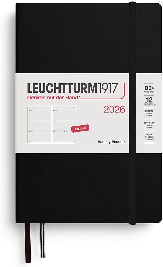 Planer tygodniowy Leuchtturm1917 B6+ Paperback 2026 | poziomy Planer tygodniowy na 2026 rok w kolorze czarnym to niezawodne narzędzie do planowania każdego dnia, od stycznia do grudnia. Układ tygodnia na jednej stronie zapewnia wygodną organizację obowiązków przez cały rok. Na początku znajdziesz przegląd lat 2025, 2026 i 2027, co ułatwia planowanie długoterminowe. Planer zawiera fazy księżyca oraz święta międzynarodowe — idealne dla osób pracujących w międzynarodowym środowisku. Dodatkowy planer projektów pomaga zaplanować większe zadania i cele. Perforowane, odrywane strony na końcu notesu sprawdzą się na szybkie notatki, którymi możesz się łatwo podzielić. Rozkładana kieszeń pomieści luźne dokumenty, karteczki czy wizytówki. Dwie wstążkowe zakładki pozwalają szybko wrócić do najważniejszych miejsc w planerze. Dołączone etykiety samoprzylepne ułatwiają oznaczanie i archiwizowanie. Papier o wysokiej jakości jest przystosowany do różnych rodzajów atramentu i zapewnia komfort pisania.