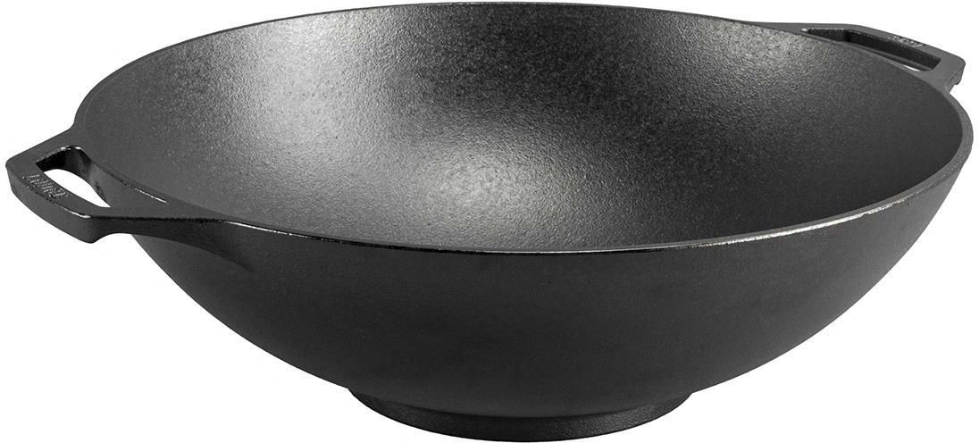 Lodge - Wok żeliwny 35 cm Solidny wok z żeliwa Lodge równomiernie się nagrzewa. Dowykorzystaniana wszystkich źródłach ciepła, również na kuchenkach indukcyjnych. Podwójne uchwyty gwarantują łatwość manewrowania patelnią. Należy myć ręcznie, a po umyciu wycierać do sucha i nacierać niewielką ilością tłuszczu.Wyprodukowany w USA. Wymiary: 25,2 cm [średn.], 4.75 cm [wys.], 42,7 cm [szer. z rączkami] Kolor: czarny Materiały: żeliwo Waga: 5,8 kg