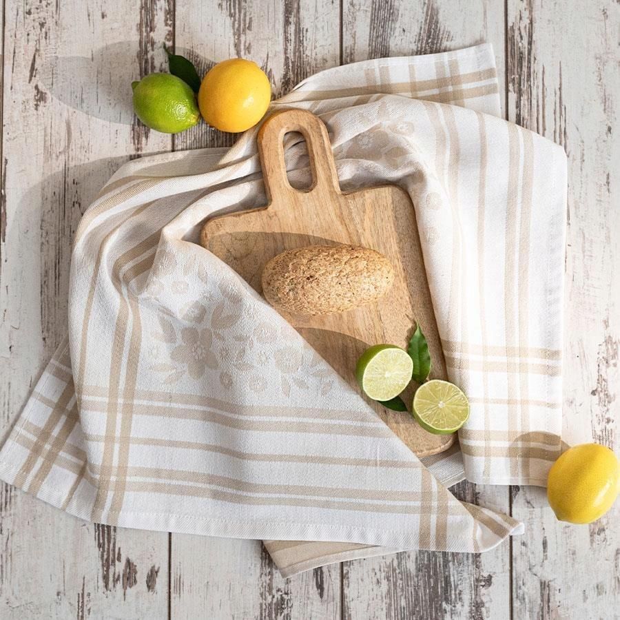 Beżowa ścierka 100% bawełniana w kwiaty i paski 50x70 cm Ścierki to niezbędny element wyposażenia każdej kuchni. Ułatwią wykonanie wszystkich zadań, a przyrządzanie posiłków czy utrzymanie czystości stanie się przyjemniejsze. Ścierka kuchenna wykonana w 100% z bawełny to połączenie funkcjonalności i trwałości. Dzięki wysokiej chłonności i miękkości, ta ścierka jest niezastąpiona w codziennych pracach kuchennych. Dodatkowo, bawełna jest materiałem oddychającym, co oznacza, że ścierka szybko schnie po użyciu, zapobiegając rozwojowi nieprzyjemnych zapachów i bakterii. Subtelny wzór w paski i kwiaty dodaje jej unikatowego charakteru i wyrafinowania. Dzięki wysokiej jakości bawełny, ścierka zachowuje swoje właściwości chłonne i estetyczny wygląd nawet po wielu praniach. Cechy produktu Rozmiar: 50x70 cm Skład: 100% bawełna Rodzaj tkaniny: bawełna Gramatura: 200 g/m2 Tolerancja wymiaru: +/- 3% Marka: Markizeta Zalety Bardzo chłonne Szybko schnące Wysoka jakość- wytrzymałość Można prać w pralce w 40°C Uniwersalne Niezbędne w kuchni