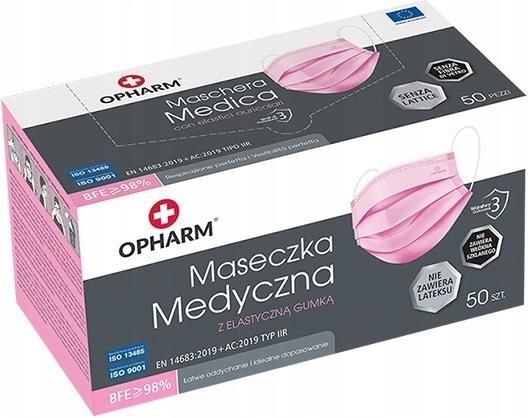3 warstwowe medyczne maski typu IIR z gumkami różowe - 50 sztuk NAJWYŻSZA OCHRONA – maska filtrująca to doskonały sposób na ochronę dróg oddechowych przed bakteriami chorobotwórczymi oraz infekcjami wirusowymi. Noszona przez osoby zarażone zmniejsza ryzyko rozprzestrzeniania się choroby do minimum. Maseczka wykonana została ze specjalnej włókniny fi