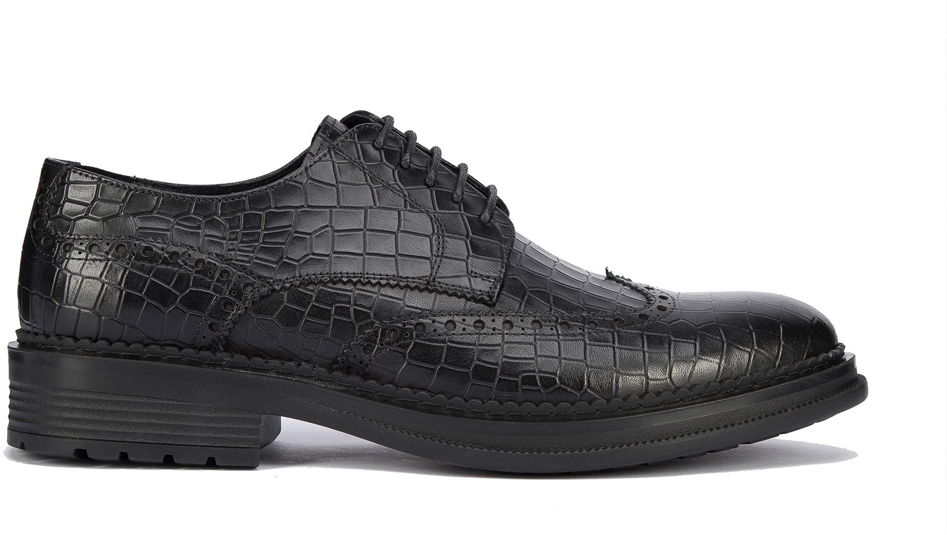 Męskie buty skórzane. Te oryginalne męskie buty to wyjątkowy dodatek dla nowoczesnego mężczyzny. Wykonane zostały z wysokiej jakości skóry naturalnej o fakturze croco, dzięki czemu przyciągają wzrok i urozmaicają każdą stylizację. Zdobienia na nosku i bokach stylowo dopełniają całość. Mają grubą podeszwę, która doda kilku centymetrów wzrostu, a wyraźne żłobienie zapewni stabilność przy różnej pogodzie. Ten model dopełni codzienny strój z dżinsami i koszulą, a stylizacja z chinosami i marynarką nabierze dzięki niemu nowego charakteru. Męskie półbuty ze skóry croco to świetny wybór dla mężczyzn lubiących wyróżniać się z tłumu.Nasza rada: jeśli lubisz oryginalne dodatki, ten model jest dla Ciebie. 100% skóra naturalna; podeszwa z elastycznego tworzywa sztucznego; skórzana wkładka; wyściółka ze skóry i z tkaniny; nosek migdał; sznurowane; ozdobne dziurkowanie. skóra naturalna skóra naturalna / material włókienniczy materiał syntetyczny