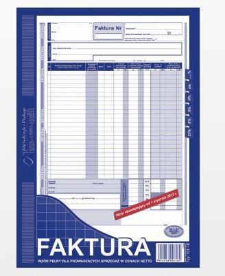 101-1E FAKTURA WZÓR PEŁNY DLA PROWADZĄCYCH SPRZEDAŻ W CENACH NETTO * format:A4 * rodzaj papieru:samokopiujący * zastosowanie:faktury i inne dokumenty wynikające z przepisów o podatku od towarów i usług * oprawa:bloczek 80 kartek * druk:jednostronny (oryginał + kopia)