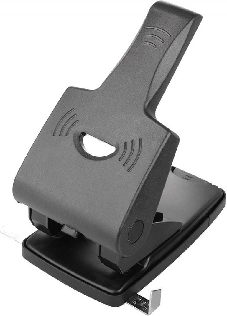 dziurkacz do 65 kartekmechanizm, ogranicznik formatu i obudowa metalowegłębokość wsuwania kartek: 12mmodstęp pomiędzy dziurkami: 80mmśrednica dziurki: 5,5mmogranicznik formatu: 888, A3, A4, A5, A6, B4, B5, B6, B7antypoślizgowa plastikowa nakładka na podstawęwskaźnik środka stronyposiada wbudowaną blokadę ramieniametalowe ramię pokryte tworzywem sztucznymna dziurkaczu nazwa markipakowany po 1szt. w kartonowe pudełkogwarancja 5 latkolor: czarny