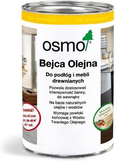 OSMO BEJCA OLEJNA pozwala zabarwić podłogę bez widocznych przejść kolorystycznych. Naniesienie jednej warstwy Bejcy Olejnej nada drewnu piękny odcień, podkreślający idealnie naturalny rysunek słojów drewna. Dwie warstwy Bejcy Olejnej zabarwią je bardzo intensywnie, nadając mu wyrazisty, głęboki kolor. Zalety: 10 atrakcyjnych odcieni kolorów, przezroczystych lub intensywnych; Produkowane na bazie naturalnych olejów; Aplikacja nie wymagająca wysiłku (szpachla lub polerka jednotarczowa); Nadaje się do pokrywania podłóg drewnianych, schodów, OSB, korka, mebli i wielu innych; Pozostawia naturalną dla drewna strukturę mikroporów (nie pęka, nie łuszczy się, nie zadziera ani nie tworzy pęcherzyków – pozwala mu oddychać). Aplikacja: Barwienie transparentne: Bejcę rozprowadzić szpachlą, pędzlem lub wałkiem Osmo; Następnie bejce należy wyrównać polerką jednotarczową z białym padem; Czas schnięcia ok. 12 godzin ( w normalnym klimacie, w temp. 23oC / 50% wilgotności względnej powietrza). W niższych temperaturach lub/i przy wyższej wilgotności wydłuża się czas schnięcia. Należy zapewnić dobrą wentylację pomieszczenia. Barwienie intensywne: Dla osiągnięcia intensywnego koloru nałożyć drugą warstwę bejcy szpachlą, pędzlem lub wałkiem Osmo, a następnie wyrównać ją za pomocą polerki jednotarczowej z białym padem; Czas schnięcia ok. 12 godzin ( w normalnym klimacie, w temp. 23oC / 50% wilgotności względnej powietrza). W niższych temperaturach lub/i przy wyższej wilgotności wydłuża się czas schnięcia. Należy zapewnić dobrą wentylację pomieszczenia. Po etapie 3 lub 5 nałożyć warstwę bezbarwnego Wosku Twardego Olejnego Osmo i pozostawić powierzchnię do wyschnięcia Dane techniczne: Zużycie: ok. 30 m2/l na warstwę; Okres przydatności: 5 lat lub dłużej w szczelnie zamkniętym opakowaniu; Przechowywanie: W suchym miejscu, nie narażając na działanie źródeł ciepła ani mrozu.