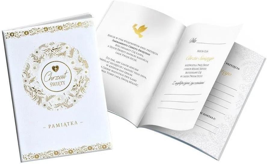 PAMIĄTKA - KSIĄŻECZKA Z OKAZJI CHRZTU ŚWIĘTEGO !!! Pamiątka - Książeczka z okazji Chrztu Świętego. Książeczka to produkt wyjątkowy - pięknie wydany z flokowaną okładką z nylonu zdobioną perłową i złotą folią oraz dodatkami takimi jak perły i z kolorowym wnętrzem, pięknymi grafikami i cytatami oraz życzeniami oraz miejscem na osobistą dedykację. Na wewnętrznej stronie zdobionej złotą lub srebrną folią okładki wklejona jest specjalna, nieduża koperta, w której można przekazać kartę podarunkową lub banknot. Sakrament Chrzestu Świętego to wyjątkowa okazja godna wyjątkowego prezentu, który zapadnie w pamięć - a taka właśnie jest ta kartka. Wymiary książeczki z życzeniami 21cm x 15cm W środku książeczki znajduje się dopasowana koperta na banknoty lub kartę podarunkową. ŚRODEK KSIĄŻECZKI