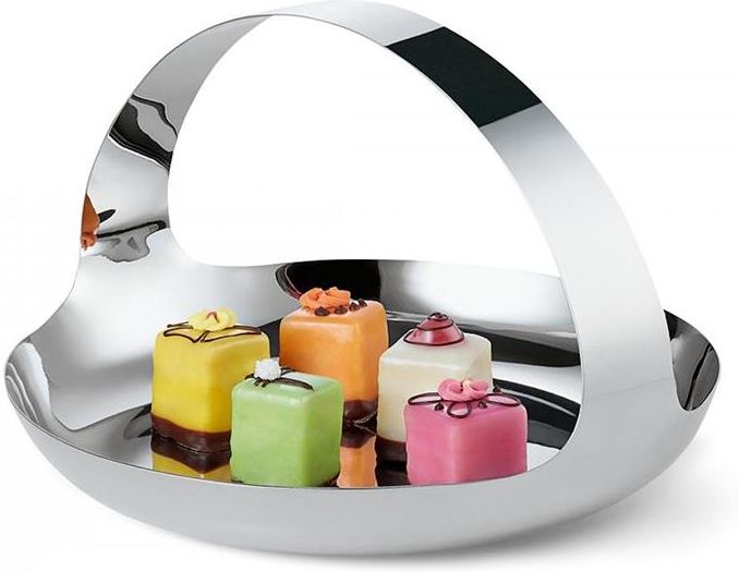 Patera Petit Philippi Podstawowe informacje Producent: Philippi Kod produktu: P105004 Kolor: srebrny Materiał: stal nierdzewna Wymiary: 26 cm (śr.) Pojemność: Patera nie musi mieć kształtu misy ani tacy na nóżce, może mieć bardziej oryginalny kształt, taki jak np. Petit marki Philippi. Przypomina ona koszyk i dzięki temu wyposażona jest w wygodny uchwyt do przenoszenia. Wyższe brzegi zapobiegają zsunięciu się zawartości. Patera wykonana jest z polerowanej stali nierdzewnej i doskonale nadaje się na babeczki, czekoladki, kawałki ciasta itp. Kolorowe kremy oraz lukry pięknie odbijają się w lustrzanych ściankach. Patera zwraca uwagę elegancką, minimalistyczną stylistyką. Idealna na prezent na wiele okazji.