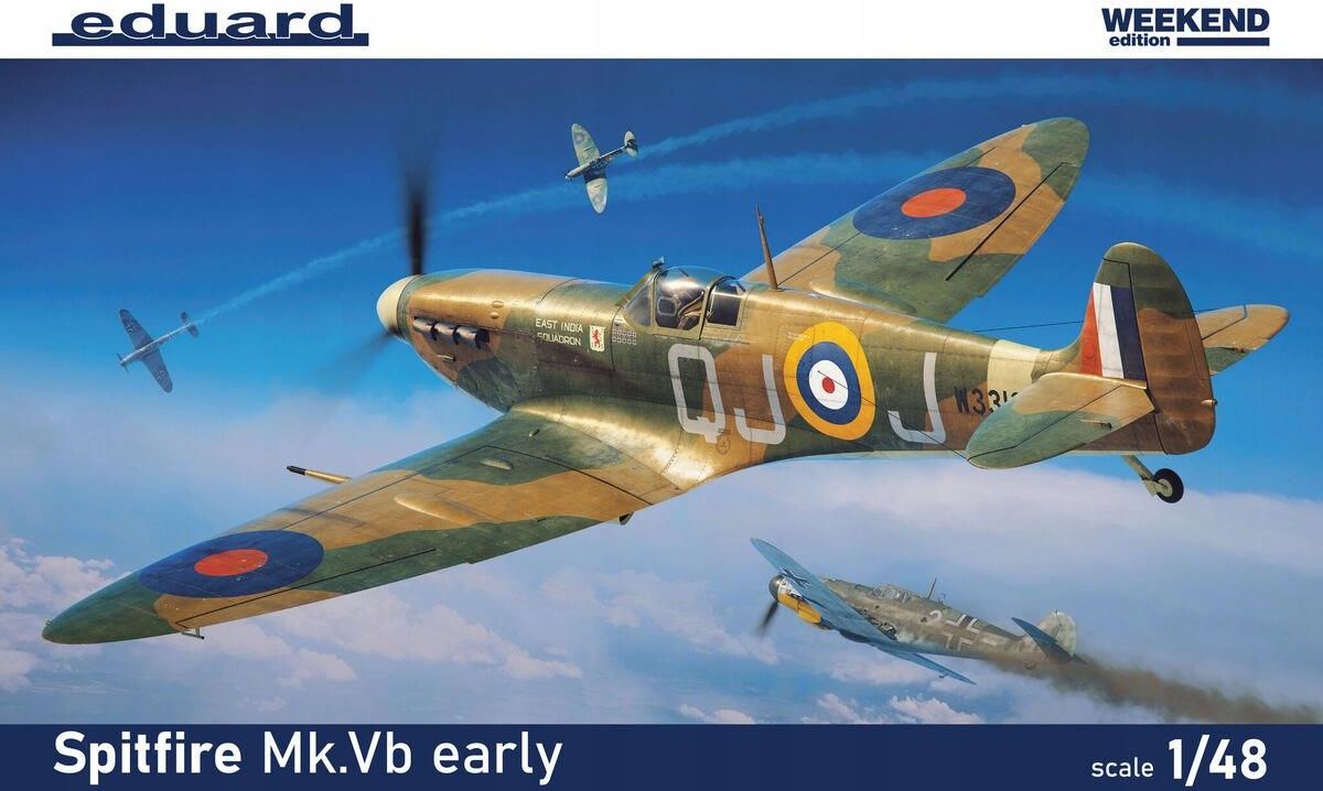 Weekendowa edycja zestawu brytyjskiego samolotu myśliwskiego Spitfire Mk.Vb z okresu II wojny światowej w skali 1/48. Wszystkie Spitfirey to wczesna wersja z pancernym szkłem przed przednią szybą i symetrycznymi wybrzuszeniami pod skrzydłami. Edycja: Weekend Części plastikowe: Eduard Cześci PE: Nie Maska do malowania: Nie Liczba opcji kalkomanii: 5 Części z żywicy: Nie Oznaczenia: W3312, S/Ldr James Rankin, 92 Dywizjon, RAF Biggin Hill, Wielka Brytania, czerwiec-sierpień 1941 r. W3312, W/Cdr James Rankin, Skrzydło Biggin Hill, RAF Biggin Hill, Wielka Brytania, sierpień-grudzień 1941 r. W3257, F/Lt Eric S. Lock, 611 Dywizjon, RAF Hornchurch, Wielka Brytania, lipiec-sierpień 1941 r. W3774, P/O William V. Crawford-Compton, 485 Dywizjon, RAF Kenley, Wielka Brytania, listopad 1941 - marzec 1942 P8537, Sgt J. Hloužek, 313 Dywizjon, RAF Hornchurch, Wielka Brytania, listopad 1941 - marzec 1942