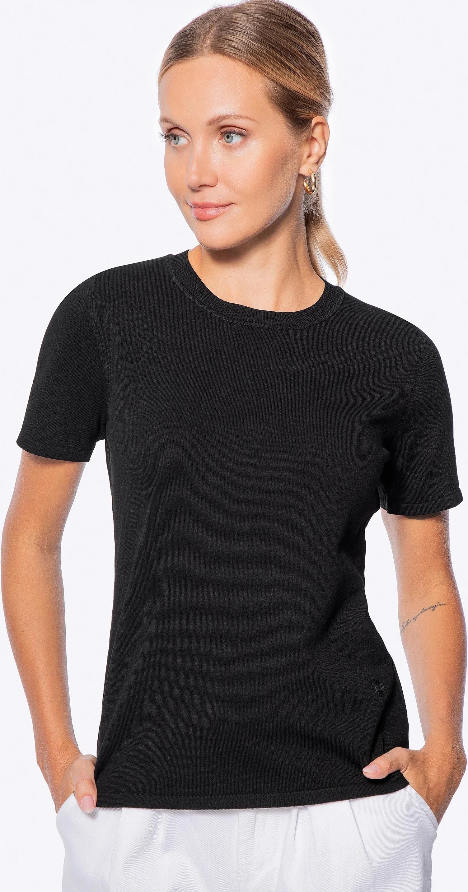 Sweter damski z krótkim rękawem – subtelna elegancja na co dzień Ten sweter to idealne połączenie lekkości i subtelnej elegancji. Delikatna wiskoza i nylon otula skórę miękko i komfortowo przez cały dzień. Krótki rękaw ze starannym wykończeniem dodaje klasy, a prążkowany dekolt pięknie eksponuje szyję. Delikatnie dopasowany fason zapewnia wygodę i swobodę ruchów, a haftowane logo w dolnym rogu dopełnia całość stylowym, dyskretnym akcentem. Dla kogo? Jeśli cenisz delikatne formy, subtelne detale i ponadczasowe rozwiązania w codziennej garderobie, ten sweter jest dla Ciebie. To model idealny zarówno do pracy, jak i na niezobowiązujące spotkania. Nasza rada: Połącz sweter z rozkloszowaną spódnicą midi lub eleganckimi spodniami z wysokim stanem. Dodaj baleriny lub mokasyny, a uzyskasz lekki, ale dopracowany look na każdą okazję. Kluczowe cechy: Materiał: Cienka, delikatna dzianina z wiskozy i nylonu zapewnia wyjątkowy komfort noszenia, lekko otulając ciało i dopasowując się do sylwetki z naturalną swobodą. Krótki rękaw ze starannym wykończeniem: Subtelnie pogrubione wykończenie nadaje rękawom elegancki wygląd. Okrągły dekolt z prążkowanym obszyciem: Subtelnie wyprofilowany, delikatnie przylega do szyi, dodając całości lekkości i elegancji w codziennym wydaniu. Fason: Delikatnie dopasowany krój harmonijnie podkreśla sylwetkę, nie ograniczając przy tym swobody ruchów – idealny balans pomiędzy komfortem a kobiecą formą. Detale: Haftowane logo producenta w lewym dolnym rogu to subtelny, ale charakterystyczny akcent, który podkreśla dopracowany styl i dbałość o wykończenie. Skład: Wiskoza 89%, nylon 11%. Postaw na model, który zachwyca delikatnością i uniwersalnością – bazowy element stylowej, kobiecej garderoby.