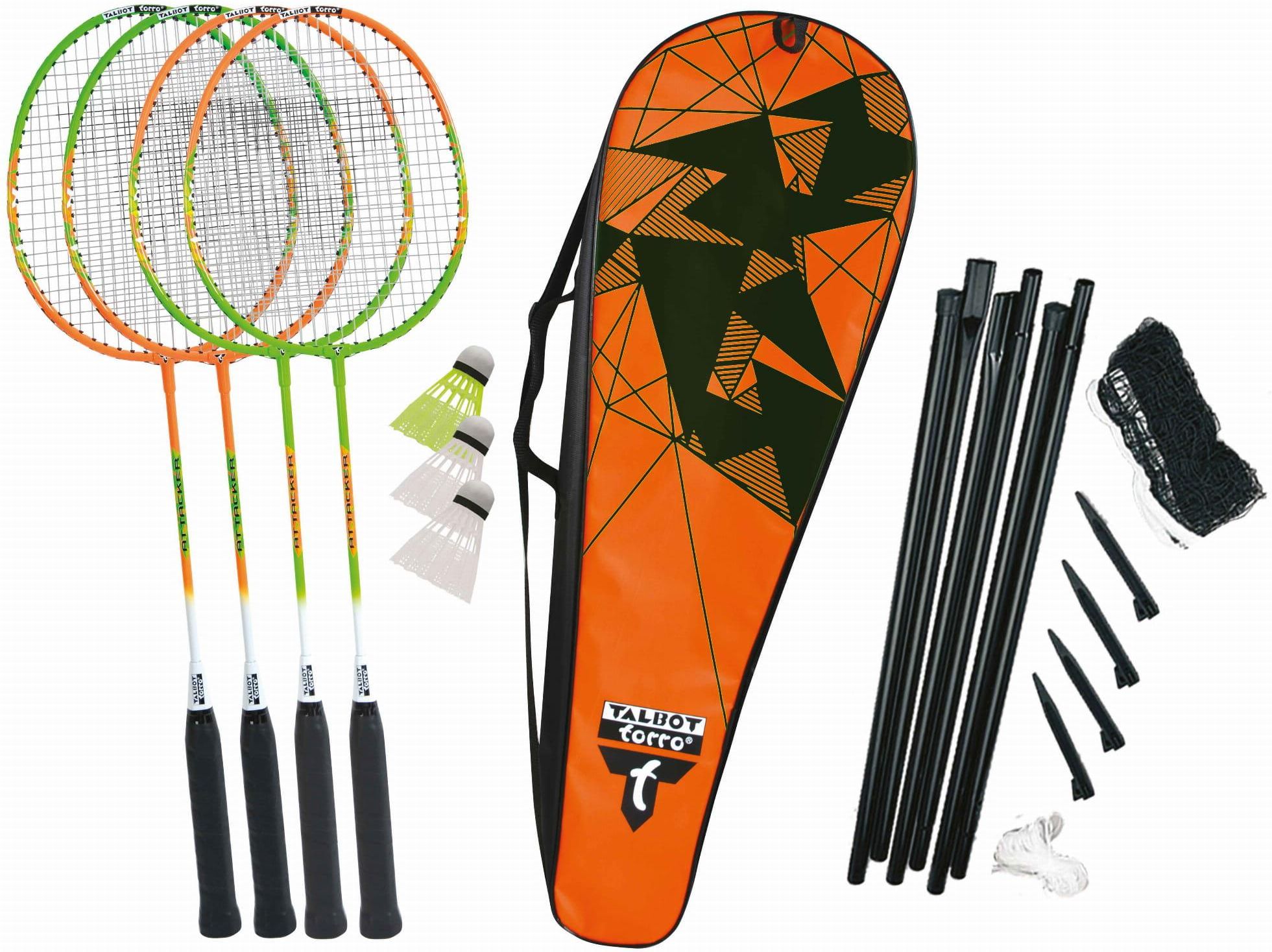 Zestaw do badmintona renomowanej niemieckiej firmy Talbot Torro, 4-ATTACKER SET ,4 rakiety Attacker (hartowna stal) z widocznym T-joint 3 nylonowe lotki z korkowym końcem z plastikowej tubie,siatka ze słupkami. Wszystko w estetycznym , nylonowym pokrowcu zamykanym na suwak z paskiem na ramię.