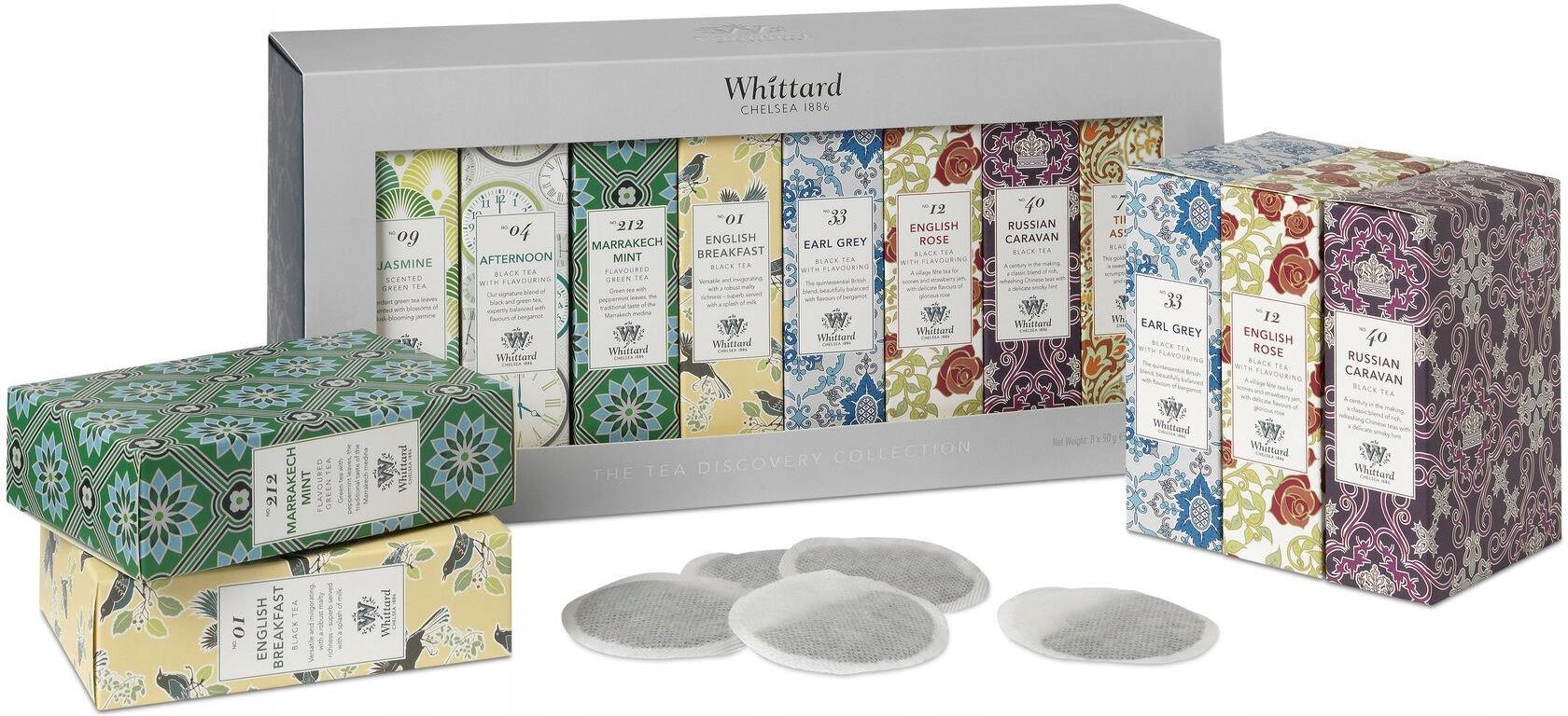 Zestaw herbat Whittard of Chelsea The Tea Discovery Collection, 8 x 20 szt. Firma Whittard of Chelsea została założona przez Waltera Whittarda, który w 1886 roku otworzył w Londynie herbaciarnię. Herbata „English Breakfast“ już od ponad stu lat jest ulubioną herbatą klientów.✨ Masz dość picia tej …