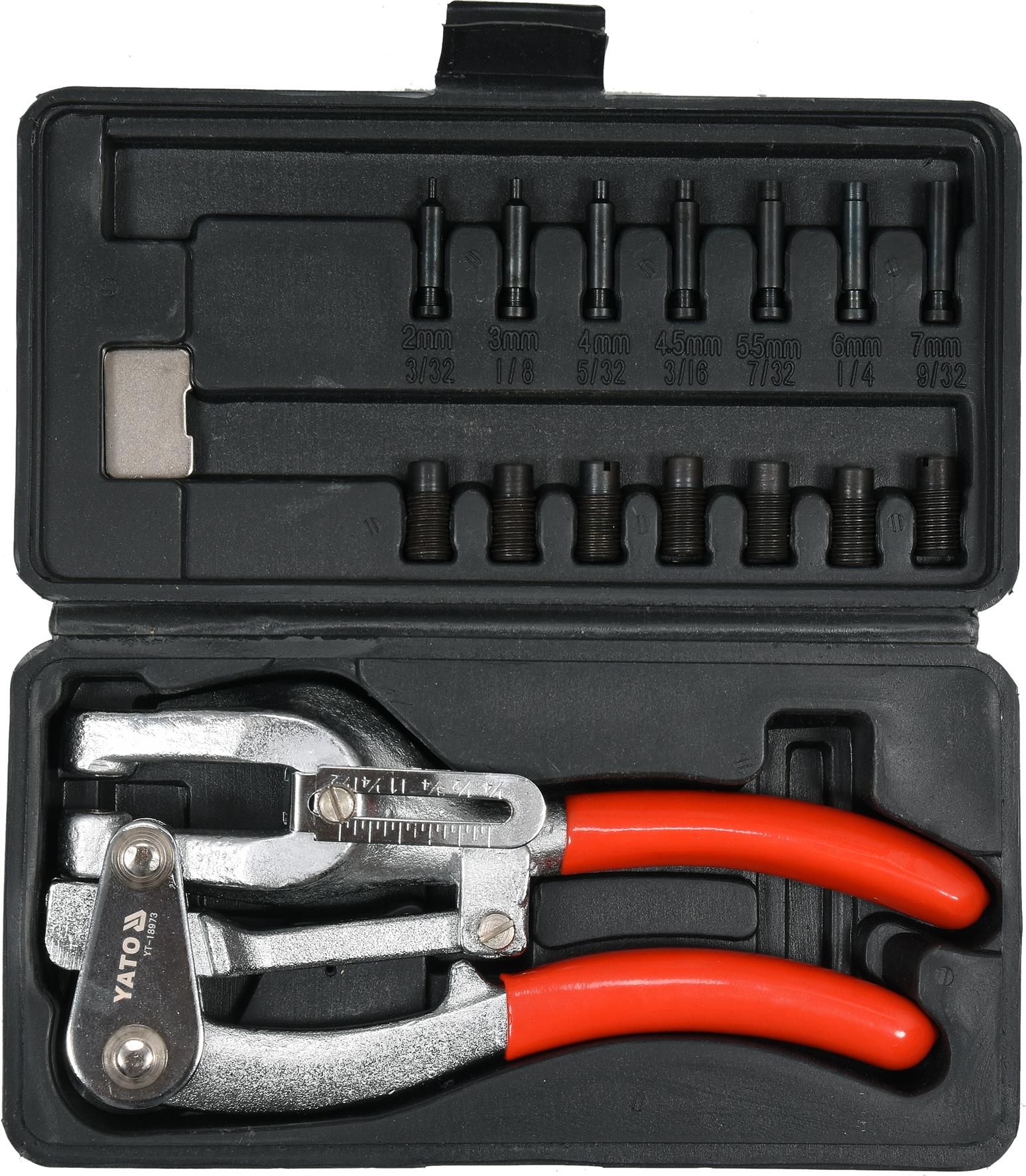 Yato YT-18973 Ręczny dziurkacz do blach 7 średnic Kod produktu: YT-18973 Yato YT-18973 Ręczny dziurkacz do blach 7 średnic Kute szczypce z zestawem 14 matryc i stempli przeznaczonych do przebijania blach o grubości do 1 mm. Mogą być wykorzystywane do perforacji tworzyw sztucznych lub kartonów. W zestawie znajdują się wymienne , hartowane matryce i stemple o średnicach: 2, 3, 4, 4.5, 5.5, 6, 7 mm . Regulacja odległości otworów od krawędzi materiału w zakresie od 6,35 do 38 mm . Zestaw zapakowane w kasetkę z odpornego tworzywa. Przeznaczenie / zastosowanie Szczypce przeznaczone są do wykonywania otworów w blachach miękkich o grubości do 1 mm a także do perforacji kartonów , tworzyw sztucznych i innych materiałów. Sposób użycia Umieścić w korpusie odpowiedniej średnicy matrycę i stempel wycinający , Wsunąć w szczelinę roboczą / pomiędzy stemplem a matrycą / obrabiany materiał i silnie ścisnąć ramiona szczypiec. Zawartość opakowania Szczypce 1 para, matryce i odpowiednie stemple wycinające 7 par , wykonany z blach wkrętak do mocowania elementów tnących. Średnice stempli: 2, 3, 4, 4.5, 5.5, 6, 7 mm