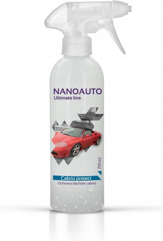 NANOAUTO Cabrio Protect - impregnat do dachów materiałowych Pojemność: 250ml Innowacyjny preparat wykorzystujący nanocząsteczki do zabezpieczenia materiałowych dachów samochodów typu Cabrio. Zastosowanie nanotechnolgii zapewnia zabezpieczenie każdego pojedynczego włókna zabezpieczonej powierzchni dzięki temu preparat tworzy bardzo mocną i trwałą nanopowłokę.