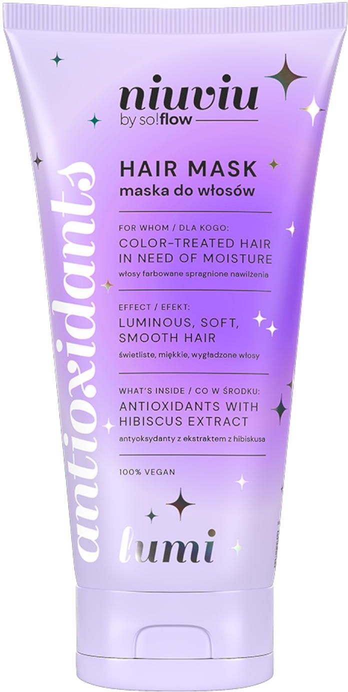 so!flow LUMI Hair Mask With Antioxidants, 200 ml, Maseczki do włosów dla kobiet, Masz poczucie, że Twoje włosy wymagają intensywniejszej pielęgnacji niż ta, którą potrafią zapewnić odżywki lub balsamy? Maska do włosów so!flow LUMI Hair Mask With Antioxidants doskonale wzbogaci Twoją rutynę pielęgnacyjną. Dzięki wysokiemu stężeniu substancji aktywnych skoncentrowanych na rozwiązaniu konkretnych problemów, przywraca włosom zdrowie i piękno. Wnika głęboko do włókien włosów, wzmacnia je, intensywnie odżywia, wspiera ich regenerację i wygładza ich powierzchnię, dzięki czemu pozostają wyjątkowo miękkie w dotyku pełne blasku i bardziej odporne na uszkodzenia. Właściwości: intensywnie nawilża regeneruje włosy na całej długości ułatwia rozczesywanie, zapobiegając uszkadzaniu włosów nadaje włosom olśniewający blask poprawia elastyczność włókien włosów włosy są miękkie w dotyku przedłuża żywotność koloru Skład: produkt wegański Sposób użycia: Stosuj na wilgotne włosy, umyte szamponem. Pozostaw na włosach tyle czasu, ile podano na opakowaniu, a potem dokładnie spłucz.