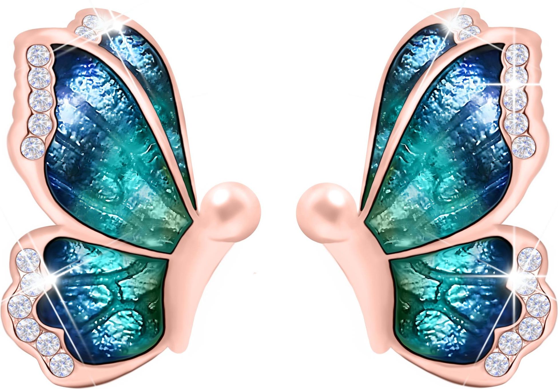 Kolczyki Motyle Surowiec: Srebro Próba: 925 Pokrycie: Różowe Złoto pr.750 oraz Niebiesko-Błękitna Emalia Kamienie: Cyrkonie Zapięcia kolczyków: Sztyft Wymiary: Wysokość: 15 mm Szerokość: 11 mm Waga: ~ 2,4g Motyw: Motyl 💎 Srebro nie zawiera domieszek niklu co sprawia, że wyrób jest całkowicie …