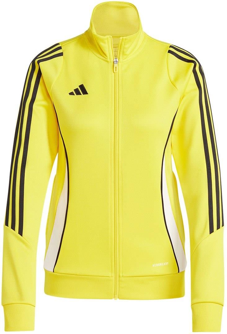 Bluza damska adidas Tiro 24 Training żółta IR9498 Bluza piłkarska adidas przeznaczona dla kobiet sprawdzi się podczas treningów. Wysoka stójka. Zamek na całej długości. Dopasowany krój. Technologia Aeroready pomaga osuszać skórę i zwiększa wygodę. Paski na rękawach. Subtelne logo. Szybkoschnące włókna. Materiał: 100% poliester z recyklingu