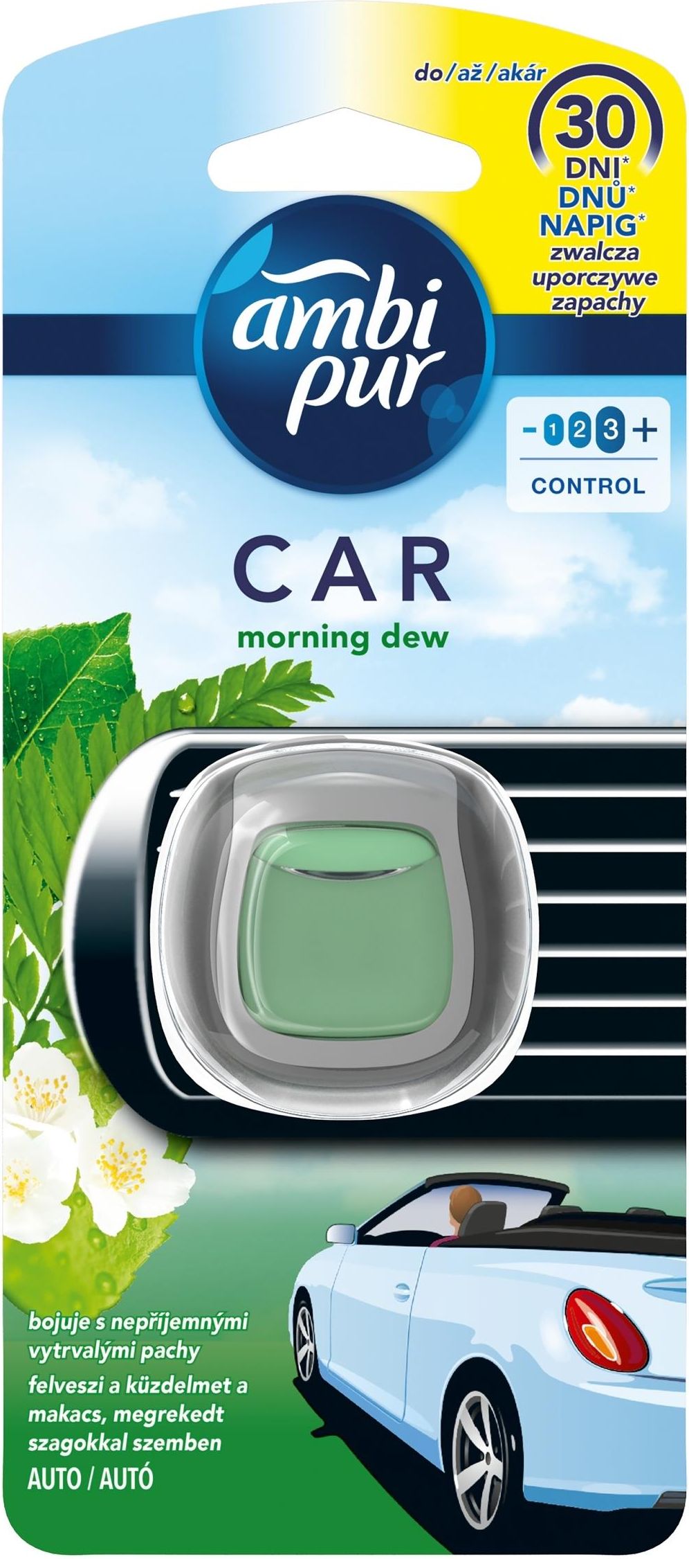 Samochodowy odświeżacz powietrza Ambi Pur Car z technologią OdourClear nieustannie oczyszcza powietrze z uporczywych, brzydkich zapachów i pozostawia delikatną, świeżą woń aż do 30 dni. Zapach Morning Dew jest inspirowany świeżością spaceru o poranku. W przeciwieństwie do większości samochodowych odświeżaczy powietrza, które tylko maskują brzydkie zapachy, Ambi Pur Car w pełni oczyszcza powietrze, pozostawiając jedynie piękną i świeżą woń. To mały, dyskretny odświeżacz powietrza, który z łatwością można zamontować na kratce wentylacyjnej samochodu. Dzięki nowej, wyjątkowej technologii OdourClear oczyszcza powietrze nawet z najbardziej uporczywych, brzydkich zapachów - na przykład po jedzeniu, zwierzętach, dymie papierosowym lub śmieciach - i odświeża wnętrze auta. Intensywność zapachu można regulować, ustawiając preferowaną wartość na bocznej tarczy. Samochodowy odświeżacz powietrza Ambi Pur Car jest łatwy w użyciu i nie wymaga baterii ani energii elektrycznej. Wystarcza nawet na 30 dni, dlatego Ty i Twoi goście możecie odetchnąć pełną piersią. Sięgnij po pełną gamę nowych produktów Ambi Pur z wyjątkową technologią OdourClear, takich jak odświeżacze do tkanin (usuwające brzydkie zapachy z siedzeń samochodu) lub odświeżacze powietrza do małych pomieszczeń w domu. Wypróbuj także odświeżacze powietrza 3volution, które usuwają brzydkie zapachy nieprzerwanie przez 90 dni. Ambi Pur Car Morning Dew Samochodowy odświeżacz powietrza, klips, 1 sztuka