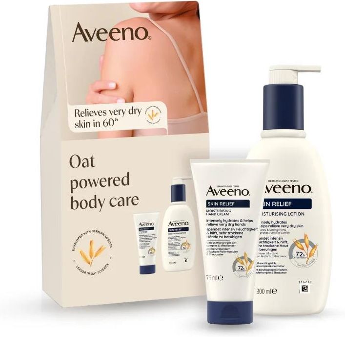 Aveeno Skin Relief innowacyjny zestaw nawilżający dla skóry suchej i wrażliwej Wszystko dla pięknej skóry w jednym opakowaniu. Zestaw kosmetyków Aveeno Skin Relief sprawi radość Tobie lub jako prezent zachwyci Twoich bliskich. Zawartość zestawu: Aveeno Skin Relief Nourishing Lotion nawilżające mleczko do ciała do bardzo suchej skóry 300 ml Aveeno Skin Relief Hand Cream krem nawilżający do rąk 75 ml Właściwości: zestaw produktów kosmetycznych do codziennego stosowania produkt zapewniający głębokie odżywienie i nawilżenie dla intensywnego nawilżenia dla uzyskania efektu pięknie wygładzonej i nawilżonej skóry Skład: bez środków perfumujących O marce: Kiedy Twoja skóra wygląda dobrze, czujesz się dobrze. Dlatego w Aveeno® opracowujemy rozwiązania do pielęgnacji skóry, które dbają o Ciebie i Twoją skórę. Od ponad 75 lat Aveeno® jest pionierem w dziedzinie suchej i wrażliwej skóry. Do tej pory skuteczność Aveeno® została naukowo udowodniona na tysiącach pacjentów ze skórą normalną, suchą, bardzo suchą, wrażliwą, a nawet skłonną do egzemy. Dzięki wykorzystaniu nauki, nasze produkty czerpią z naturalnych składników, przywracając równowagę oraz odbudowując i regenerując Twoją skórę.