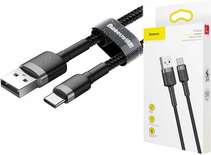 KABEL USB-A -> USB-C Baseus Cafule CATKLF-AG1 50cm 3A QC 3.0 CZARNO-SZARY W NYLONOWYM OPLOCIE Baseus Cafule Cable wytrzymały nylonowy kabel przewód USB / USB-C QC3.0 3A 0,5m czarny (CATKLF-AG1) - najważniejsze cechy: Wytrzymały kabel USB / USB-Cw nylonowym oplocie Błyskawiczne i bezpieczne ładowanie - natężenie rzędu 3A Przewód z czystej miedzi Wzmocnione łączenie - najbardziej newralgiczny punkt każdego kabla, czyli łączenie przewodu z wtyczką, zostało dodatkowo wzmocnione, by zapobiec pękaniu Ładowanie i transfer danych jednocześnie - akcesorium może przesyłać dane oraz ładować smartfona w tym samym czasie Aluminiowe wtyczki - eleganckie i wytrzymałe, odporne na ścieranie i utlenianie Nylonowy oplot - przewód w mocnym, nylonowym oplocie, trwałym, ale również przyjemnym w dotyku Praktyczny rzep ułatwiający przechowywanie i zapobiegający plątaniu się przewodu ​ Baseus Cafule Cable USB / USB-C QC3.0 3A 0,5m - wytrzymały kabel ładujący i synchronizujący w nylonowym oplocie Mocny kabel ładujący i synchronizujący dane marki Baseusz serii Cafule to produkt, który z pewnością spełni Twoje oczekiwania podczas codziennego użytkowania elektronicznych urządzeń! Kabel Baseus Cafule CATKLF-AG1 50cm został stworzony z myślą o trwałości i wydajności, co czyni go doskonałym akcesorium do ładowania i przesyłania danych. Konstrukcja kabla Baseus Cafule CATKLF-AG1 50cm jest niezwykle solidna i trwała, dzięki wykorzystaniu wysokiej jakości stopu aluminium. To gwarantuje, że kabel będzie odporny na uszkodzenia mechaniczne i wytrzyma długotrwałe użytkowanie. Oplot nylonowy, którym jest obszyty kabel Baseus Cafule CATKLF-AG1 50cm sprawia, że jest on bardziej elastyczny i odporny na splątania. ​ Baseus Cafule Cable USB / USB-C QC3.0 3A 0,5m - ładuj swoje urządzenia i przesyłaj dane w tym samym czasie Kabel Baseus Cafule CATKLF-AG1 50cm jest wielofunkcyjny. Możesz go używać do ładowania wraz z ładowarką sieciową lub samochodową, co sprawia, że jest doskonałym towarzyszem podczas podróży. Jednak jego możliwości nie kończą się na tym - Baseus Cafule CATKLF-AG1 50cm jest także świetnym narzędziem do przesyłania danych między urządzeniami, takimi jak komputer, czy stacje dokujące. Dzięki Baseus Cafule CATKLF-AG1 50cm możesz szybko i wygodnie przenosić pliki między różnymi urządzeniami. ​ Baseus Cafule Cable USB / USB-C QC3.0 3A 0,5m - kabel do zasilania i przesyłu danych odporny na uszkodzenia Konstrukcja kabla Baseus Cafule Cable USB / USB-C QC3.0 3A 0,5m jest niezwykle solidna i trwała, dzięki wykorzystaniu wysokiej jakości stopu aluminium. To gwarantuje, że kabel Baseus Cafule Cable USB / USB-C QC3.0 3A 0,5m będzie odporny na uszkodzenia mechaniczne i wytrzyma nawet długotrwałe użytkowanie. Końcówki kabla Baseus Cafule Cable USB / USB-C QC3.0 3A 0,5m zostały dodatkowo wzmocnione termoplastycznym elastomerem, co zabezpiecza je przed uszkodzeniami spowodowanymi częstym wtykaniem i wyjmowaniem kabla. Dzięki temu masz pewność, że Twój kabel Baseus Cafule Cable USB / USB-C QC3.0 3A 0,5m będzie działał bez zarzutu przez długi czas. ​ Baseus Cafule Cable USB / USB-C QC3.0 3A 0,5m - kabel prawdziwie uniwersalny! Wydajny kabel Baseus Cafule CATKLF-AG1 50cmjest w stanie naładować niemal każde urządzenie z portem USB-C - szczególnie polecany jest on do ładowania takich urządzeń jak słuchawki, telefony, tablety, a nawet laptopy. Kabel Baseus Cafule CATKLF-AG1 50cm pozwala napełnąsynchronizację danych. Kabel Baseus Cafule CATKLF-AG1 50cm może być używany zarówno do ładowania urządzeń jak i do synchronizacji danych o przepustowości do 480Mb/s. Co więcej, przewód Baseus Cafule obsługuje standard ładowania Quick Charge 3.0, dzięki któremu Twoje urządzenie będzie naładowane jeszcze szybciej! Obsługiwany maksymalny prąd ładowania: 3A. ​ Baseus Cafule Cable USB / USB-C QC3.0 3A 0,5m - nylonowy oplot, odciążniki naprężeń i pasek na rzep Kabel Cafule marki Baseus to zdecydowanie innowacyjne i solidne rozwiązanie dla wszystkich, którzy oczekują niezawodności i trwałości w codziennym użytkowaniu swoich urządzeń elektronicznych. Jego wyjątkowe cechy, takie jak nylonowy, czarny oplot, elastyczne odciążniki naprężeń i praktyczny pasek na rzep, czynią go niezastąpionym akcesorium do ładowania i przesyłania danych. Oba końce kabla Baseus Cafule CATKLF-AG1 50cm zostały wyposażone w odciążniki naprężeń wzmocnione elastycznym TPE (termoplastycznym elastomerem). To rozwiązanie zapewnia większą elastyczność końcówek kabla Baseus Cafule CATKLF-AG1 50cm, co minimalizuje ryzyko ich pęknięcia podczas zginania lub skręcania. Dzięki temu kabel jest bardziej odporny na ekstremalne warunki użytkowania, co zwiększa jego żywotność i trwałość. Baseus Cafule Cable wytrzymały nylonowy kabel USB / USB-C QC3.0 3A 0,5m czarny (CATKLF-AG1) - specyfikacja i dane techniczne przewodu: Kolor dominujący: czarny Długość kabla: 50 cm Max obciążenie prądowe [A]: 3 Quick Charge: Quick Charge 3.0 Power Delivery: nie Standard USB: USB 2.0 Hi-Speed (USB 480 Mbps) Opakowanie: pudełko Rodzaj złącza: USB-A (męski), USB-C (męski) Magnetyczna końcówka: nie Funkcjonalność kabla: ładujący / synchronizujący dane Rodzaj przewodu: w oplocie Marka: Baseus Symbol: CATKLF-AG1 EAN: 6953156278189 Seria: Cafule