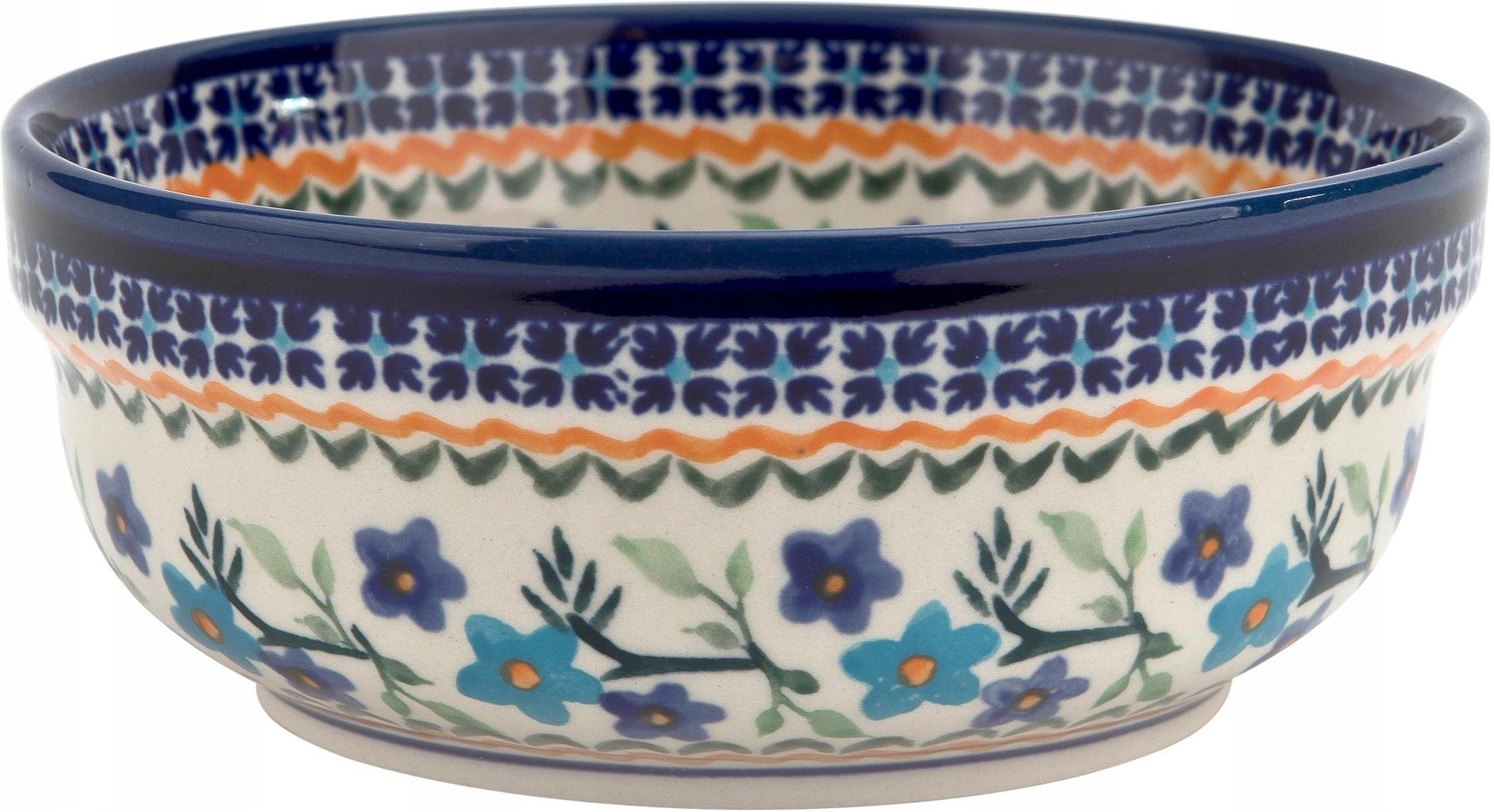 Miska 600 ml Magnolia mała Bolesławiec dek. 1154A Ceramiczna miska Magnolia o średnicy 15,7 cm. Charakteryzuje się kwiecistym wzorem w dwóch odcieniach błękitu, przeplatanym z zielonymi listkami. Dopełnieniem dekoracji są żółte szlaczki, które tworzą ciekawy kontrast. W zdobieniu dominuje barwa …
