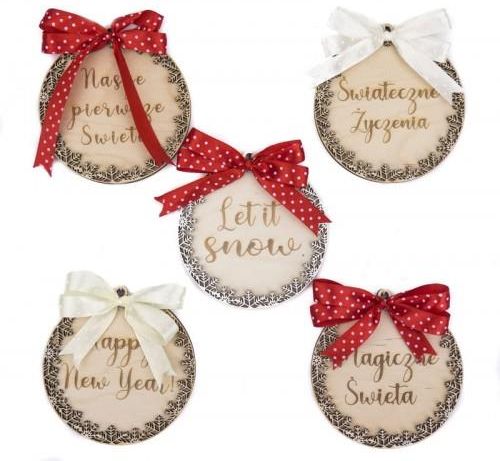 Deku – Bombka z kokardką 10x10 cm 000219 Oryginalna, ozdobna, szykowna i wyjątkowa bombka choinkowa z grawerunkiem. Wykonana ze sklejki i ozdobiona wycinanymi ornamentami w kształcie śnieżynek oraz piękną kokardą. Bombkę można powiesić na sznureczku. Jest to Idealna ozdoba na choinkę, stroik lub wieszak Świąteczny na bombki. idealnie sprawdzi się jako prezent pod choinkę lub na Święta. Mamy do wyboru kilka Świątecznych napisów lub wygrawerujemy Twój własny! specyfikacja: wymiary: szerokość: 10 cm, wysokość: 10 cm bombka wykonana jest ze sklejki brzozowej o grubości 3 mm napisy do wyboru lub indywidualny projekt: Magicznych Świąt Bożego Narodzenia Merry Christmas! Wesołych Świąt Let it snow! Nasze pierwsze Święta Magiczne Święta Świąteczne Życzenia Happy New Year!